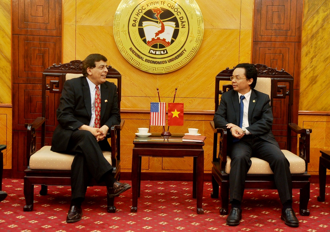 Ngày 6/4/2015, tại G2N10, PGS.TS Hoàng Văn Cường – Phó hiệu trưởng trường Đại học Kinh tế quốc dân đã có buổi tiếp và làm việc với GS. Khosrow Doroodian – Giám đốc chương trình sau đại học, Đại học Ohio, Mỹ. Tham gia tiếp GS. Khosrow Doroodian còn có PGS.TS Nguyễn Văn Thắng – Viện trưởng Viện quản lý châu Á Thái Bình Dươngvà TS. Đào Thanh Tùng – Phó trưởng phòng Phòng Hợp tác quốc tế. Bên cạnh những trao đổi về chương trình hợp tác đào tạo Thạc sỹ Kinh tế tài chính 1+1, hai bên còn đề cập đến những khả năng và cơ hội hợp tác mới trong tương lai.