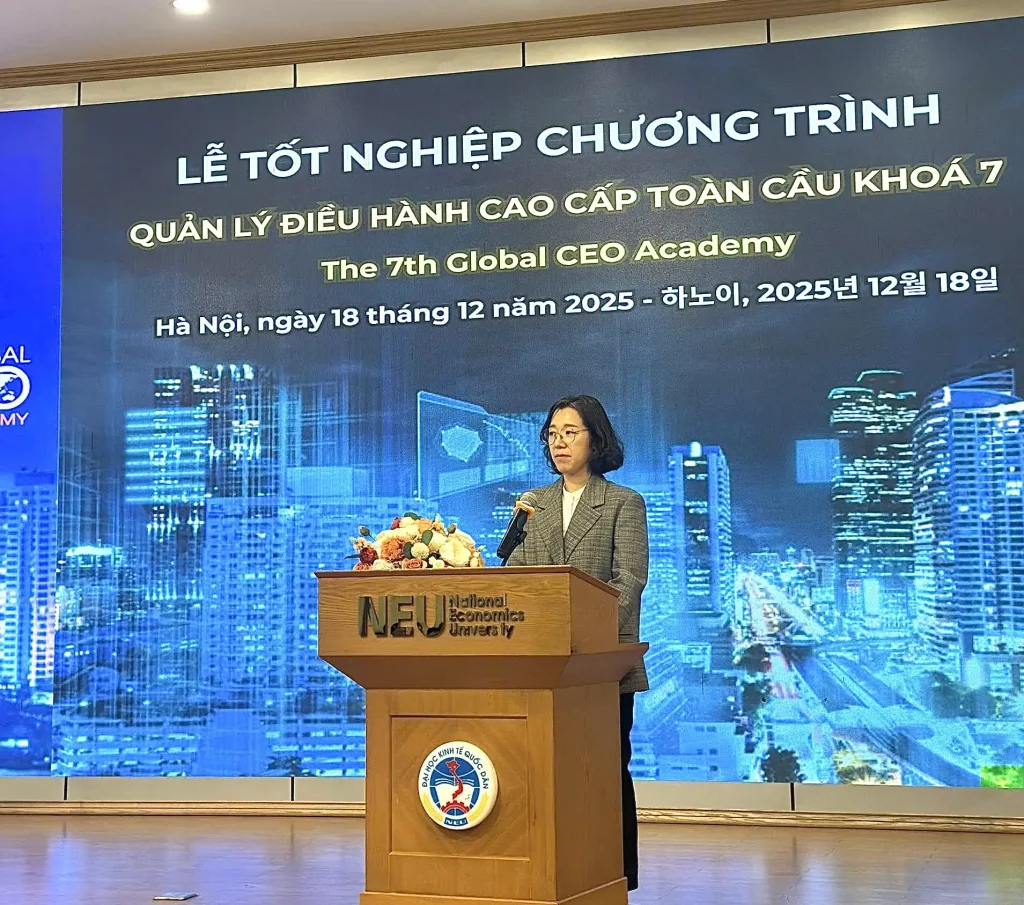 Chia sẻ tại buổi lễ, Phó Giám đốc Đại học Kinh tế Quốc dân nhấn mạnh quá trình hình thành và phát triển nhiều nỗ lực của Chương trình, từ những ngày đầu được gây dựng bởi GS. Kim Kwang Soo và các cộng sự tại Viện Quản lý Châu Á – Thái Bình Dương (nay là Viện Phát triển Bền vững), đến giai đoạn mở rộng với sự hỗ trợ của các chuyên gia do KOICA phái cử, góp phần đưa chương trình đến gần hơn với cộng đồng doanh nghiệp Hàn Quốc tại Việt Nam. Dù từng gián đoạn do ảnh hưởng của đại dịch Covid-19, chương trình đã được tái khởi động vào năm 2025 và tiếp tục khẳng định giá trị, uy tín trong đào tạo và kết nối doanh nhân.