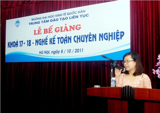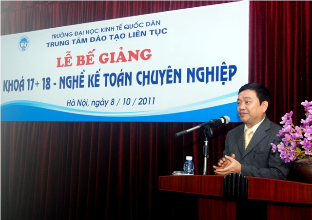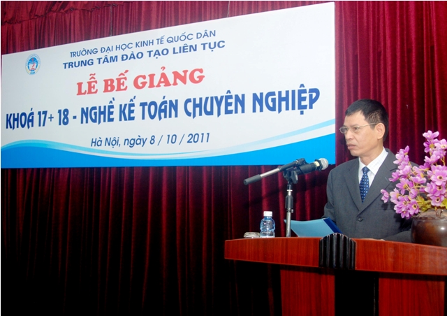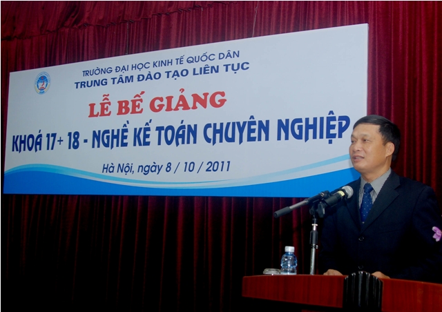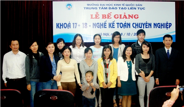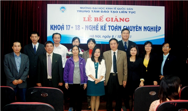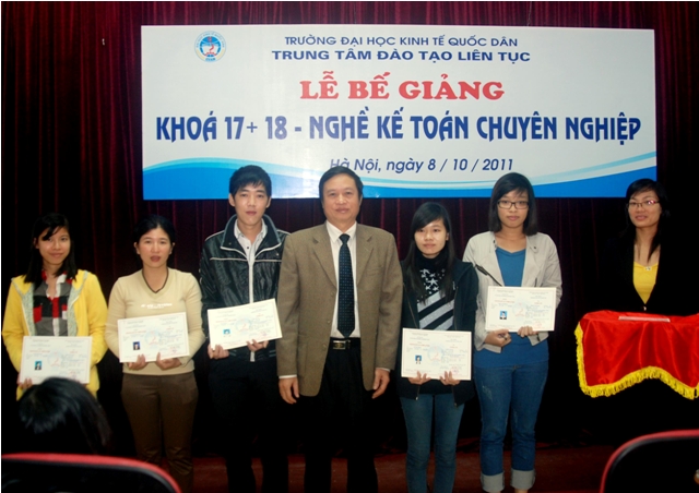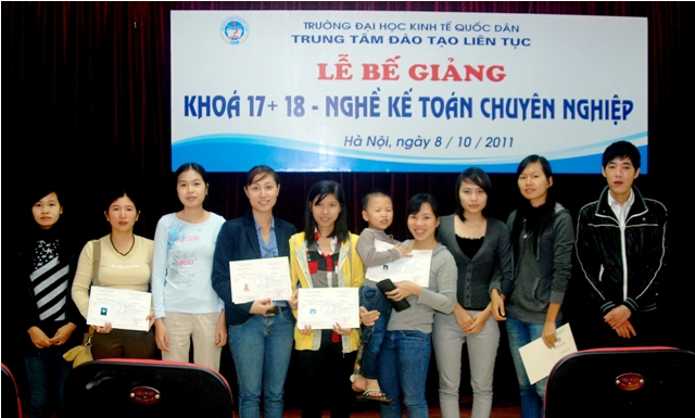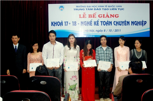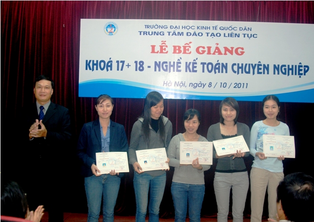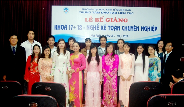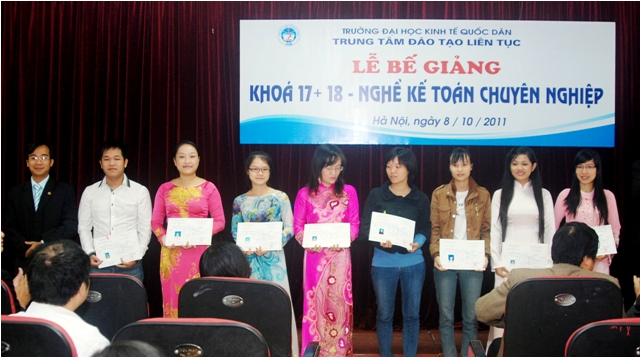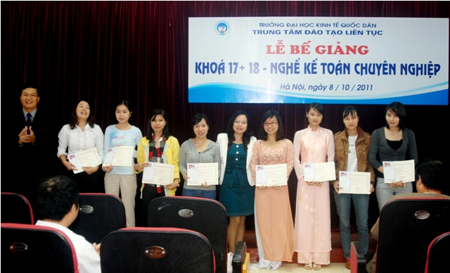 Sáng 8/10/2011, Trung tâm Đào tạo liên tục, Trường Đại học Kinh tế quốc dân tổ chức Lễ Bế giảng lớp Nghề kế toán Chuyên nghiệp khóa 17, 18 và trao chứng chỉ tốt ngiệp cho học viên đã hoàn thành khóahọc. Các học viên khóa học đến từ khu vực các trường Đại học, Cao đẳng, doanh nghiệp và các cơ quan tại khu vực Miền Bắc. Đến dự buổi lễ và trao chứng chỉ tốt nghiệp các học viên có PGS.TS Trần Thọ Đạt – Phó Hiệu trưởng, trường Đại học Kinh tế quốc dân và Các đồng chí Lãnh đạo phòng ban của trường, về phía Trung tâm Đào tạo liên tục có PGS.TS Nguyễn Anh Tuấn- Giám đốc Trung tâm đào tạo liên tục và các đồng chí lãnh đạo trung tâm cùng các cán bộ, giảng viên tham gia giảng dạy và quản lý lớp học.