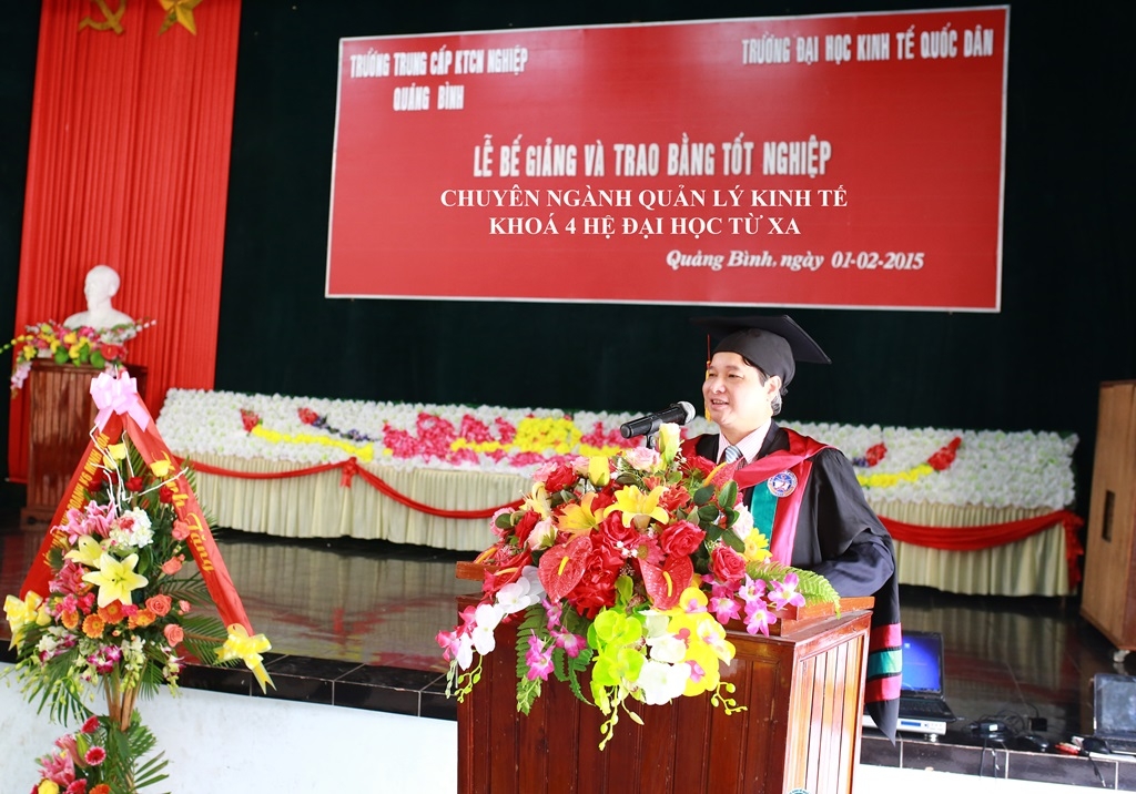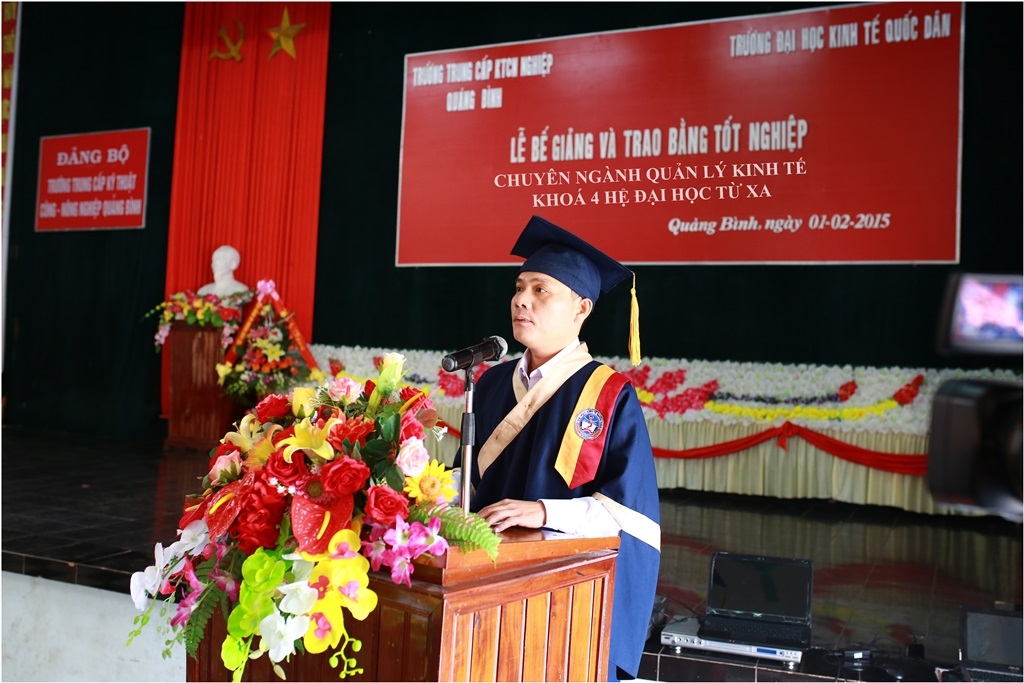 Trong niềm vui ngày tốt nghiệp, đại diện cho các tân cử nhân đã phát biểu, bày tỏ lòng biết ơn sâu sắc tớiBan lãnh đạo trường Đại học Kinh tế Quốc dân, Lãnh đạo, cán bộ quản lý Trường Trung cấp Công nông nghiệp Quảng Bình, Trung tâm đào tạo từ xa, các thầy cô giáo đã tận tình truyền đạt cho sinh viên những kiến thức, kỹ năng cần thiết, đã giúp đỡ các sinh viên trong suốt quá trình học tập và xin hứa sẽ không ngừng học hỏi nâng cao kiến thức, sẽ đem hết tâm lực, trí lực, vận dụng một cách uyển chuyển và hài hòa vào thực tiễn để minh chứng và khẳng định với xã hội rằng: Sản phẩm nguồn nhân lực mà trường Đại học Kinh tế Quốc dân cung cấp cho xã hội thông qua các chương trình đào tạo nói chung, và đặc biệt là chương trình đào tạo từ xa nói riêng là sản phẩm có chất lượng tốt – Tốt về nhân cách đạo đức – Tốt về tư duy kiến thức – Tốt về kỹ năng tác nghiệp chuyên môn.