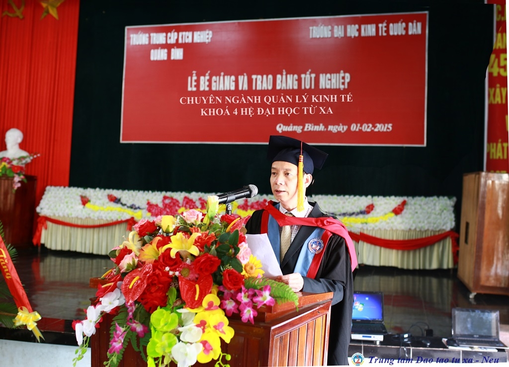 Phát biểu tại buổi lễ, GS.TS. Phạm Quang Trung – Phó Hiệu trưởng đã nhiệt liệt chúc mừng và biểu dương tinh thần vượt qua những khó khăn, ý thức chấp hành quy chế học tập, nỗ lực học hỏi và đã hoàn thành khoá học của các tân cử nhân. Qua buổi lễ Giáo sư gửi lời cảm ơn tới các Cán bộ, giảng viên khoa Khoa học Quản lý, các cán bộ quản lý tại Trung tâm ĐTTX – Đại học Kinh tế Quốc dân và Trường Trung cấp Công nông nghiệp Quảng Bình đã cùng đồng hành, quan tâm, giúp đỡ, tạo mọi điều kiện thuận lợi để các bạn sinh viên học tập trong hơn 4 năm qua và mong muốn rằng các tân cử nhân phải luôn phát huy được truyền thống của sinh viên Đại học Kinh tế Quốc dân, mang những kiến thức đã được học tập tại trường áp dụng vào thực tiễn công việc, đóng góp  nhiều hơn nữa cho gia đình và xã hội.