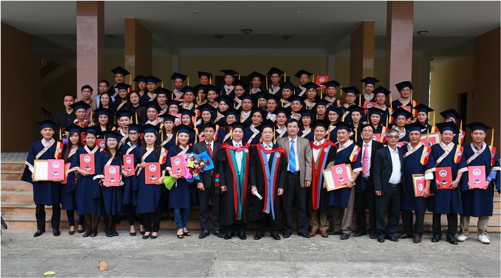 Các thầy cô giáo, quý vị đại biểu và các tân cử nhân cùng chụp ảnh lưu niệm