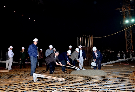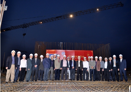 GS.TS Nguyễn Văn Nam- Bí thư Đảng ủy, Hiệu trưởng cùng các đ/c lãnh đạo Đảng ủy, BGH đang cào khối bê tông đầu tiên úp nóc khối nhà A2- Tòa nhà Trung tâm( tối 24/12AL 2012)