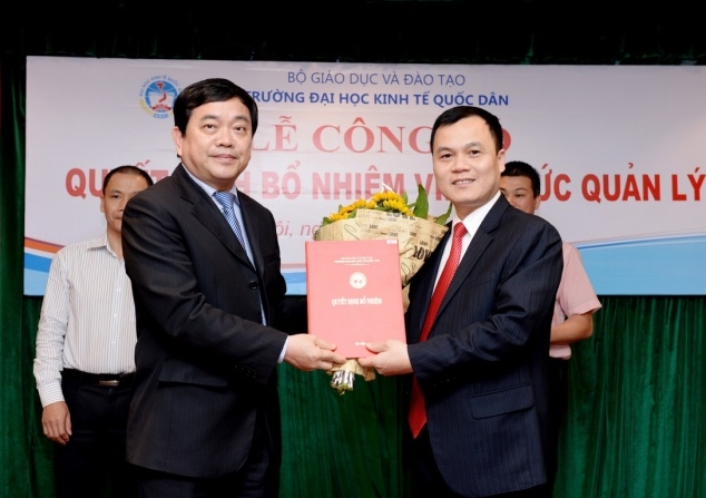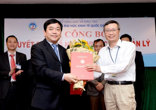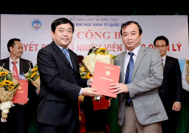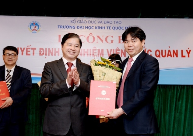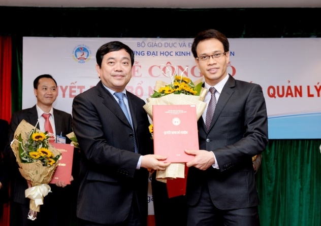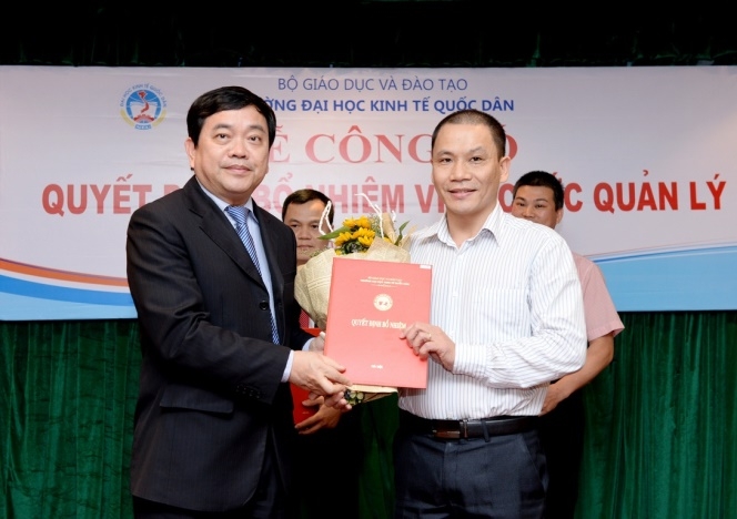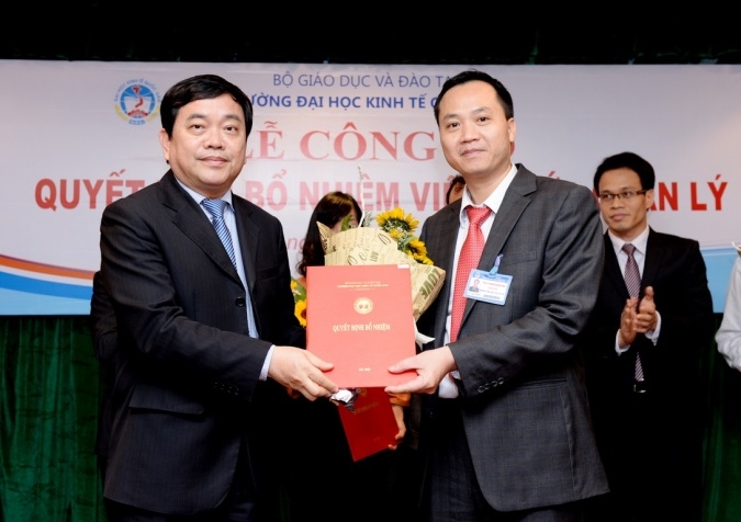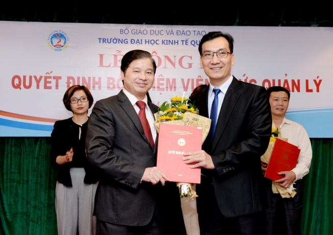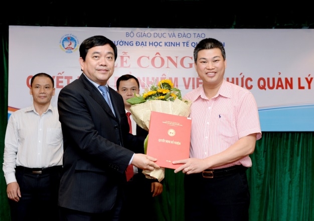 GS.TS. Phạm Quang Trung trao quyết định bổ nhiệm và tặng hoa chúc mừng TS Trần Văn Hùng -Trưởng ban Đào tạo Sau đại học thuộc Viện Quản trị kinh doanh