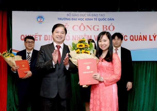 GS.TS. Phạm Quang Trung trao quyết định bổ nhiệm lại và tặng hoa chúc mừng TS Cao Thị Ý Nhi – Trưởng bộ môn Lý thuyết tài chính tiền tệ thuộc Viện Ngân hàng Tài chính