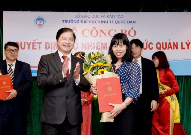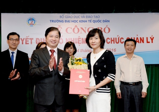 GS.TS. Trần Thọ Đạt trao quyết định bổ nhiệm và tặng hoa chúc mừng TS. Trần Thị Bích – Trưởng khoa Thống kê