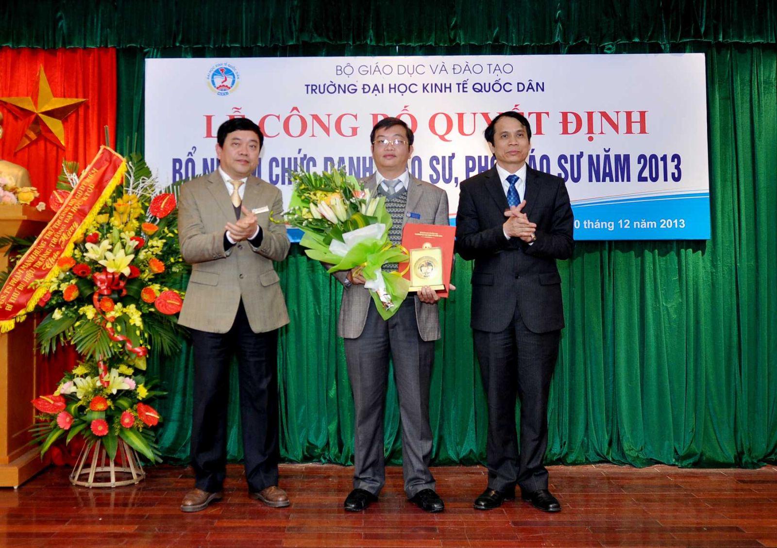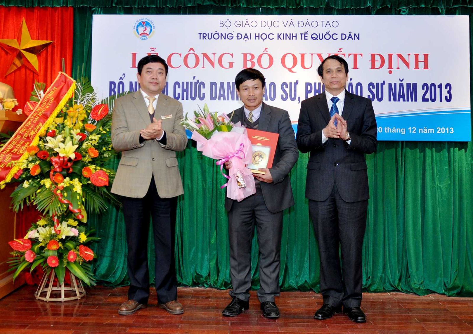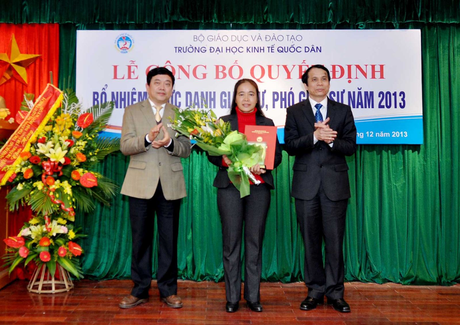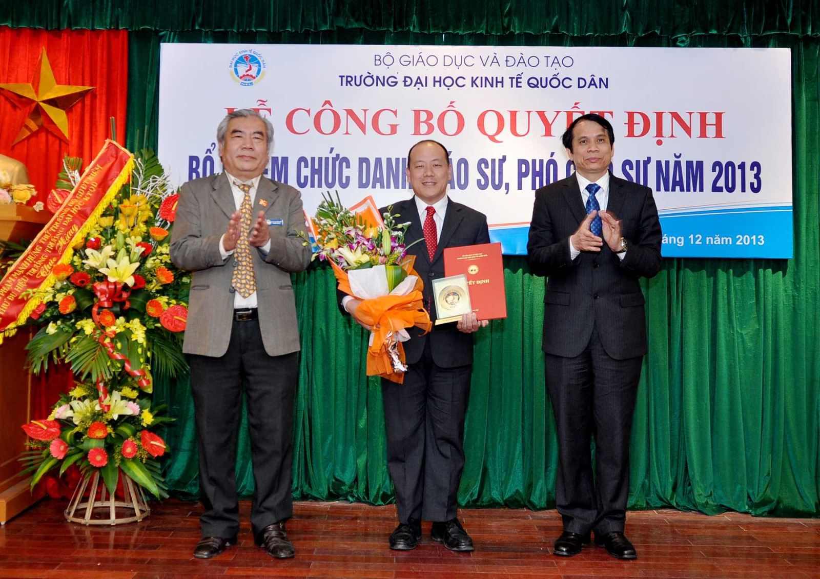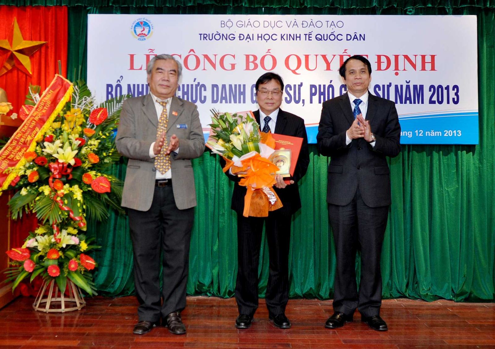 Chiều ngày 20/12/2013, tại Phòng họp G2- Nhà 10, Trường Đại học Kinh tế Quốc dân đã tổ chức Lễ công bố Quyết định bổ nhiệm Giáo sư và Phó Giáo sư năm 2013. Đến dự buổi lễ có PGS.TS Phạm Mạnh Hùng – Thứ trưởng Bộ GD và ĐT, kiêm Bí thư Đảng ủy, Hiệu trưởng; GS.TS Phan Công Nghĩa- Phó Hiệu trưởng, Chủ tịch Hội đồng Khoa học vàĐào tạo Trường, Chủ tịch Hội đồng chức danh cơ sở ; GS.TS Trần Thọ Đạt – Phó Hiệu trưởng, GS.TS Phạm Quang Trung, Phó Hiệu trưởng; GS.TS Nguyễn Viết Lâm; Đông đảo các đồng chí lãnh đạo các tổ chức chính trị xã hội, các đơn vị trực thuộc; các cán bộ, giáo viên đơn vị có Nhà giáo được bổ nhiệm chức danh GS, PGS năm 2013 cùng 12 Nhà giáo và gia đình, người thân đến tham dự buỏi lễ.