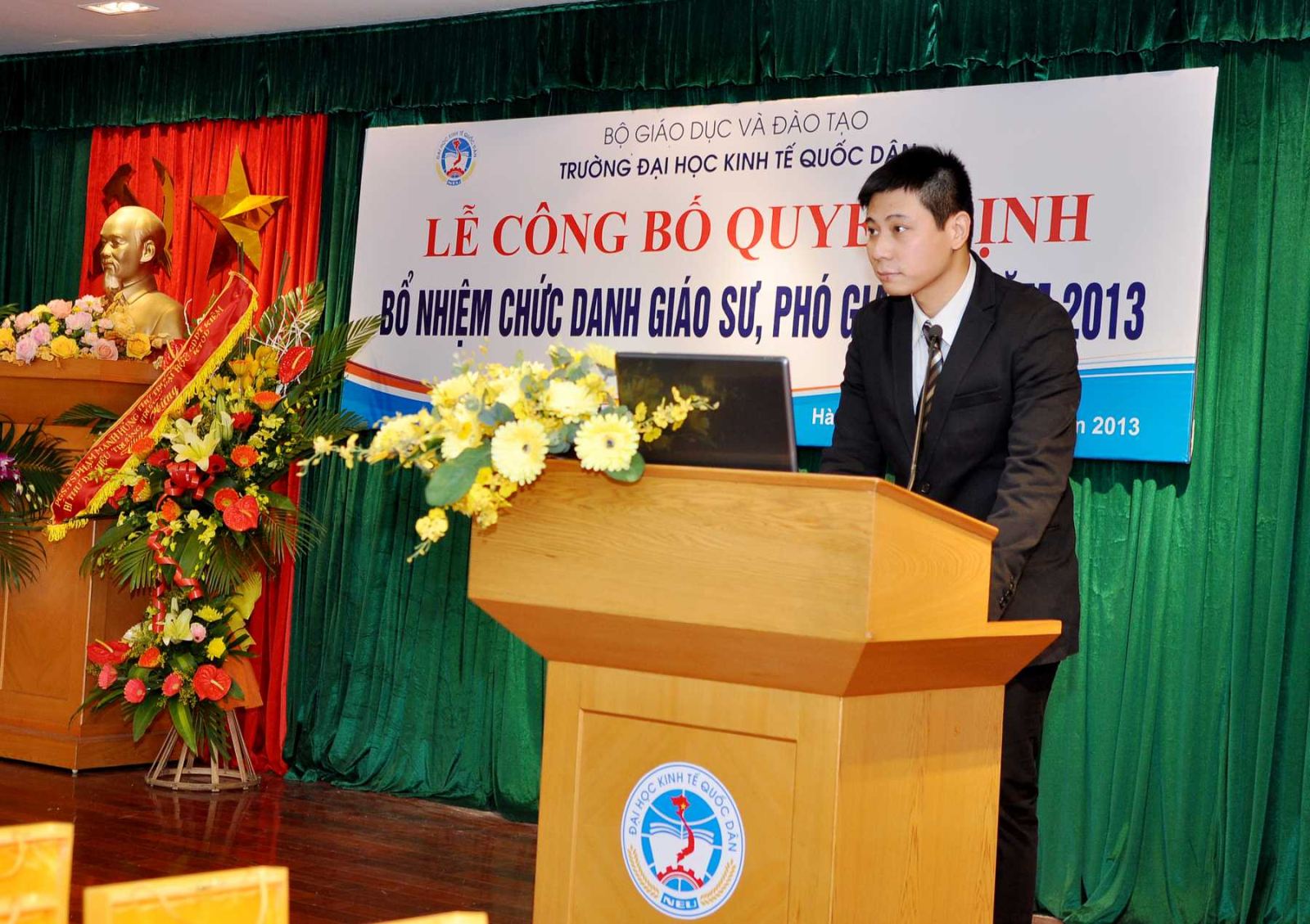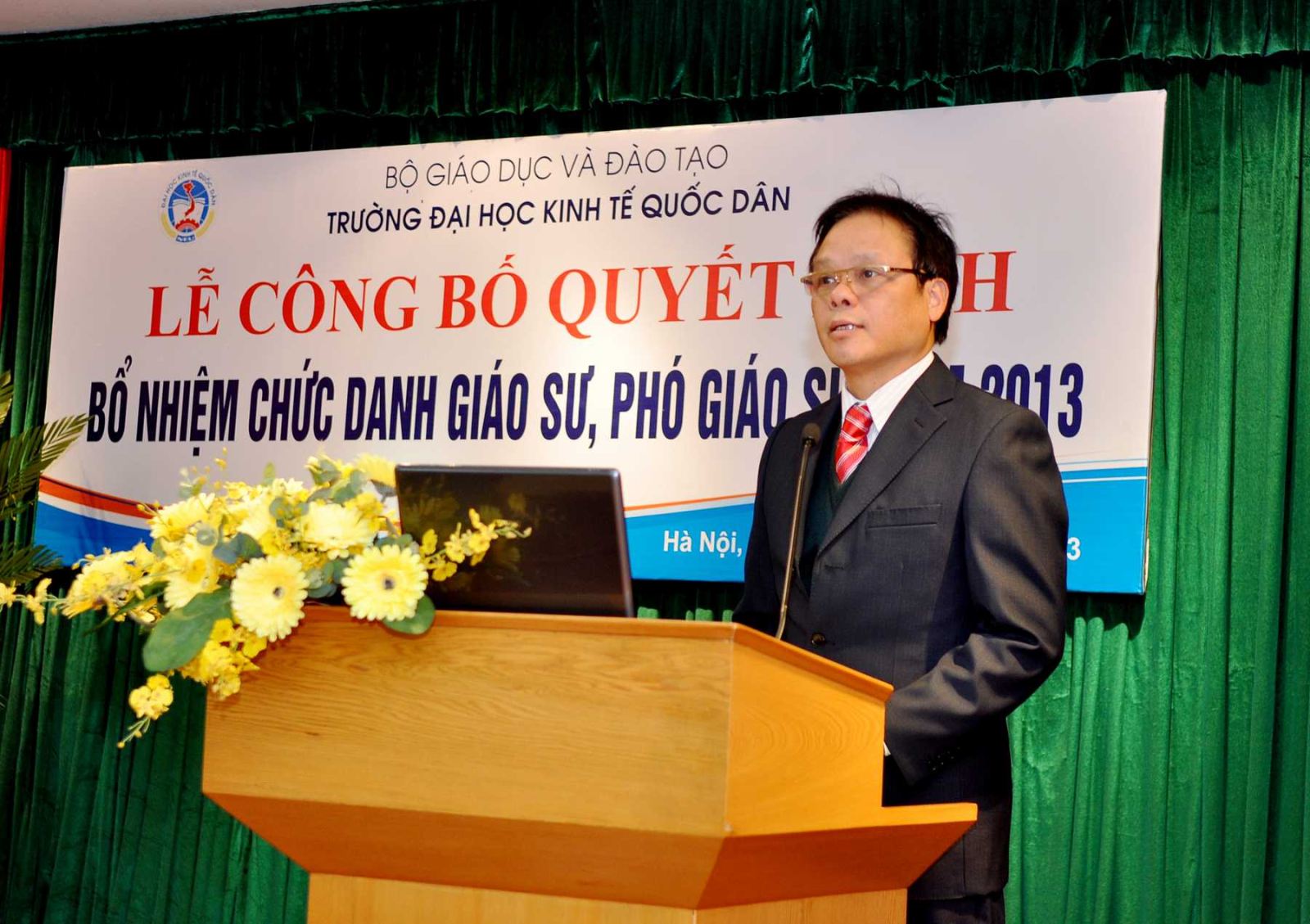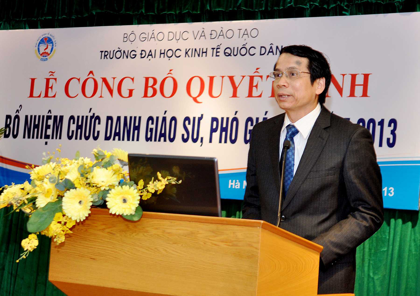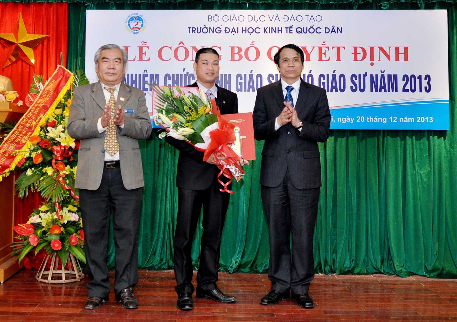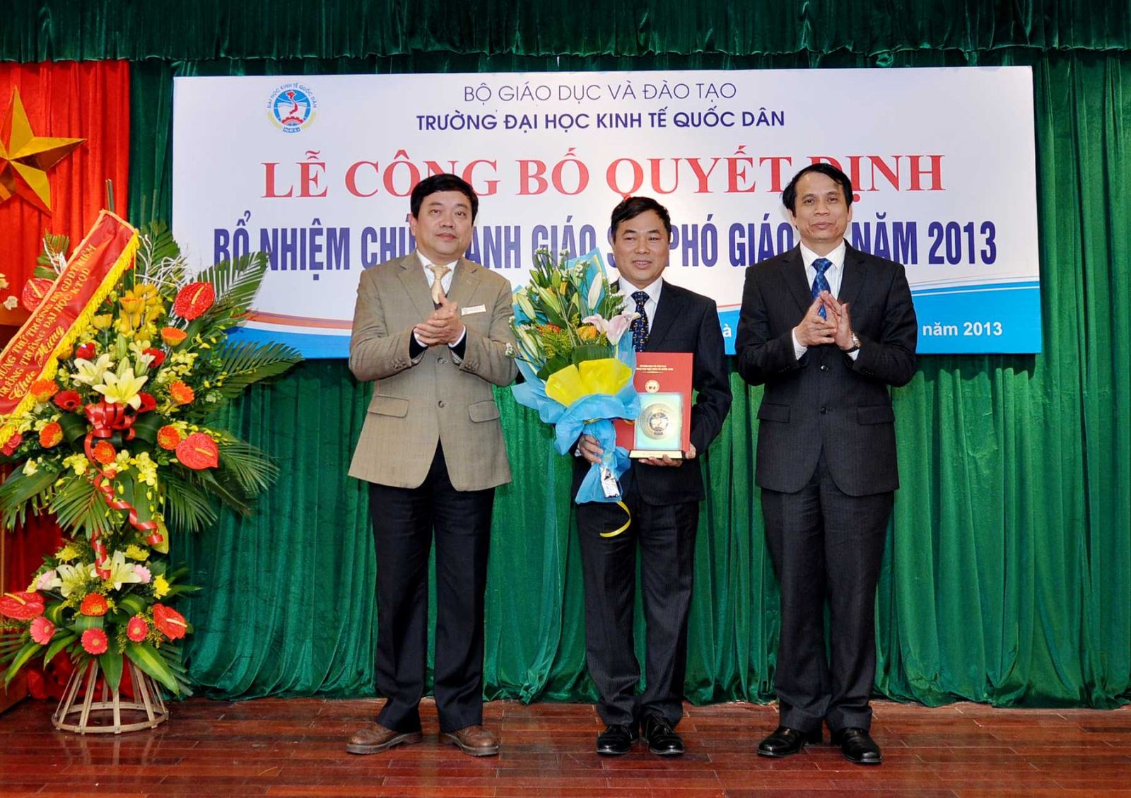 Chiều ngày 20/12/2013, tại Phòng họp G2- Nhà 10, Trường Đại học Kinh tế Quốc dân đã tổ chức Lễ công bố Quyết định bổ nhiệm Giáo sư và Phó Giáo sư năm 2013. Đến dự buổi lễ có PGS.TS Phạm Mạnh Hùng – Thứ trưởng Bộ GD và ĐT, kiêm Bí thư Đảng ủy, Hiệu trưởng; GS.TS Phan Công Nghĩa- Phó Hiệu trưởng, Chủ tịch Hội đồng Khoa học vàĐào tạo Trường, Chủ tịch Hội đồng chức danh cơ sở ; GS.TS Trần Thọ Đạt – Phó Hiệu trưởng, GS.TS Phạm Quang Trung, Phó Hiệu trưởng; GS.TS Nguyễn Viết Lâm; Đông đảo các đồng chí lãnh đạo các tổ chức chính trị xã hội, các đơn vị trực thuộc; các cán bộ, giáo viên đơn vị có Nhà giáo được bổ nhiệm chức danh GS, PGS năm 2013 cùng 12 Nhà giáo và gia đình, người thân đến tham dự buỏi lễ.