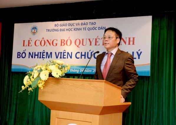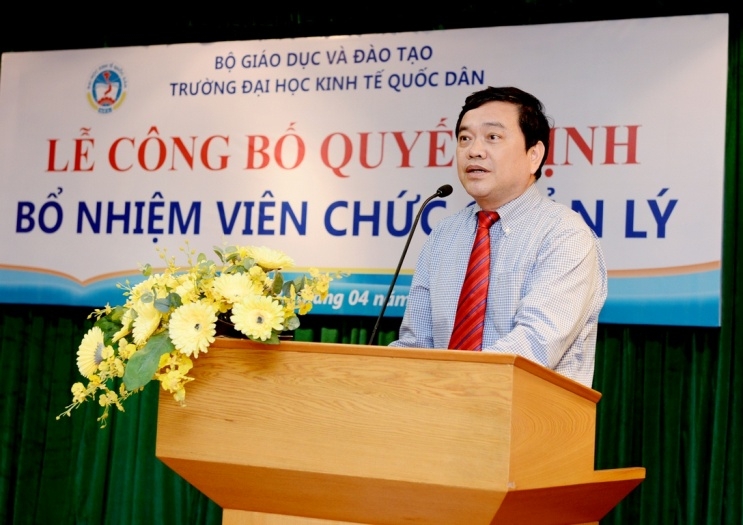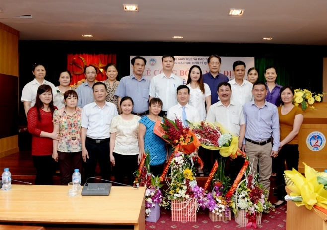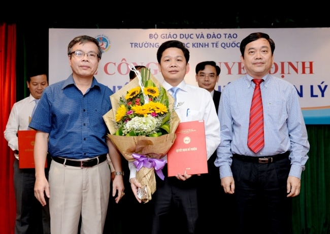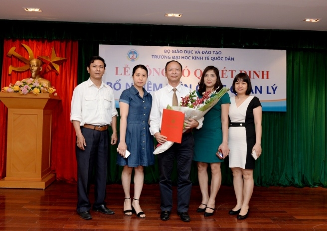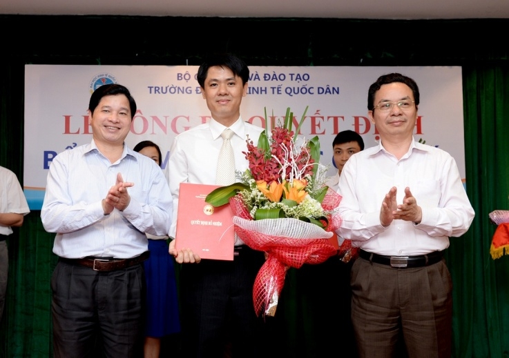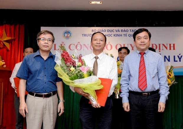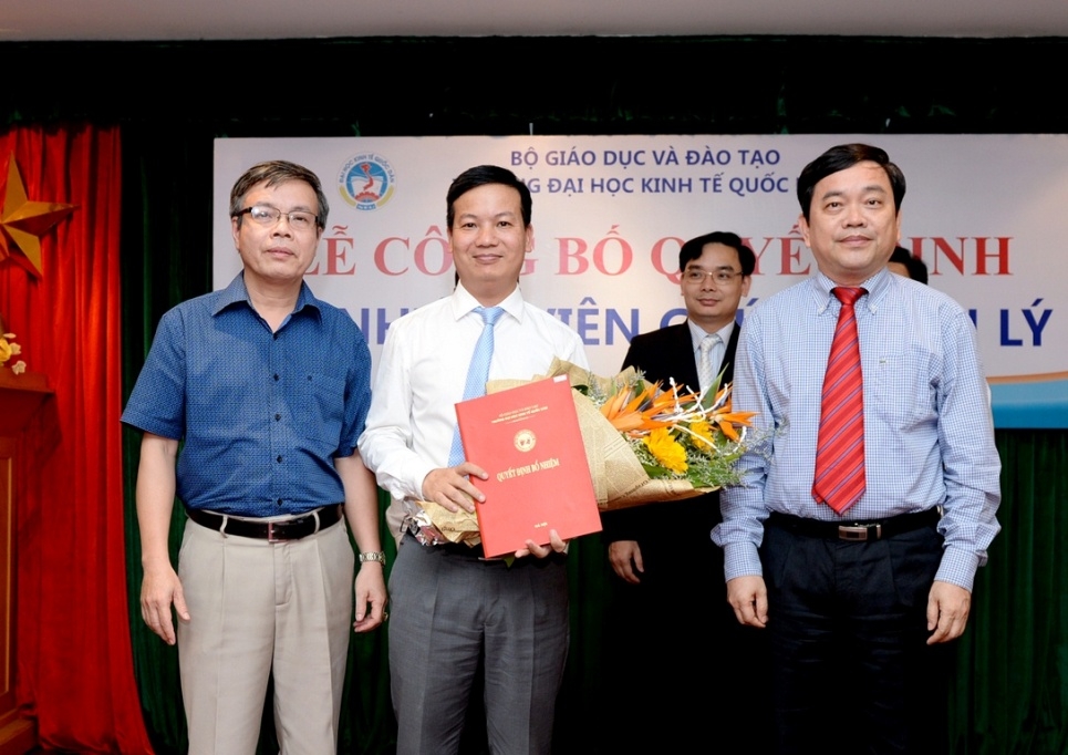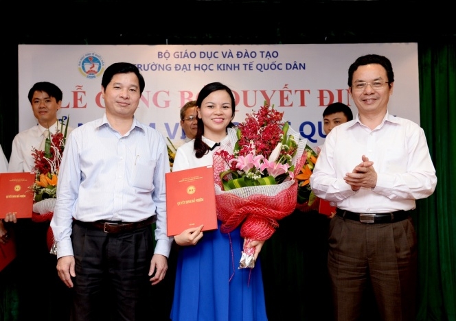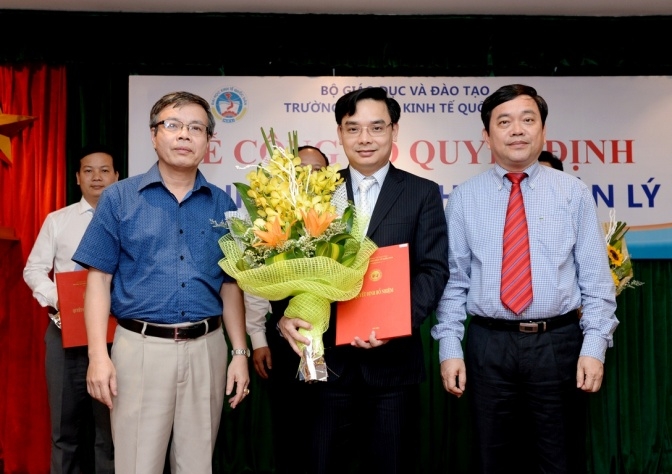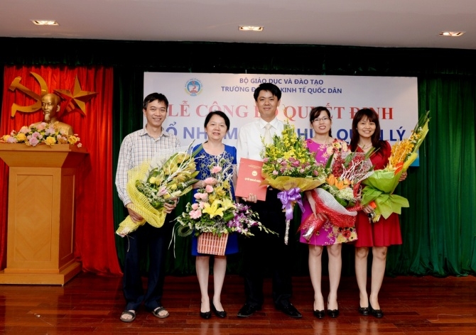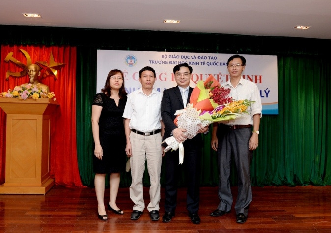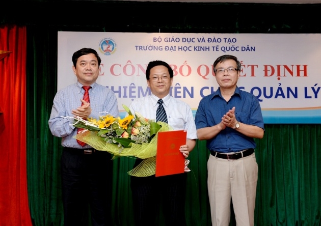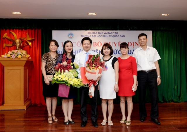 GS.TS.Trần Thọ Đạt – Hiệu trưởng và GS.TS.Nguyễn Viết Lâm – Phó Bí thư thường trực Đảng ủy trao quyết định và tặng hoa TS Nguyễn Đức Hiển – giữ chức vụ  Phó viện trưởng Viện Ngân hàng – Tài chính