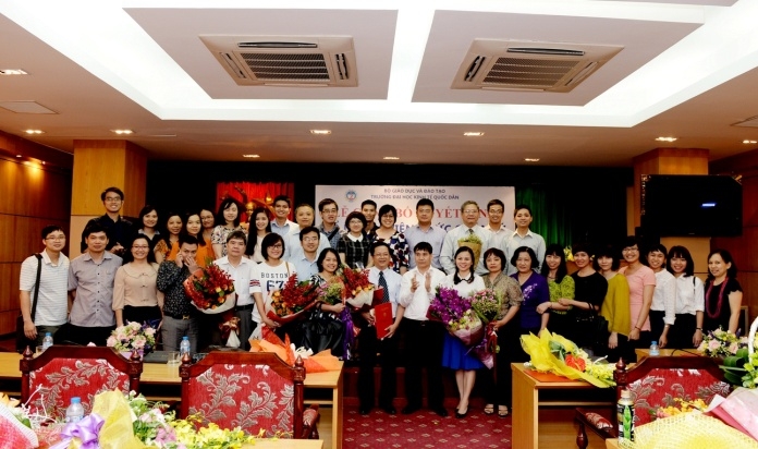 GS.TS.Trần Thọ Đạt – Hiệu trưởng và GS.TS.Nguyễn Viết Lâm – Phó Bí thư thường trực Đảng ủy trao quyết định và tặng hoa ThS Đào Thiện Quốc –  giữ chức vụ Giám đốc Trung tâm Thông tin, tư liệu, thư viện