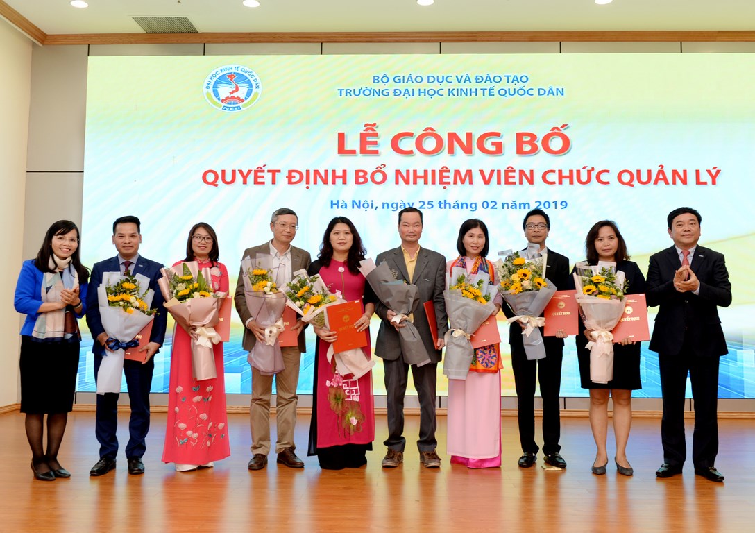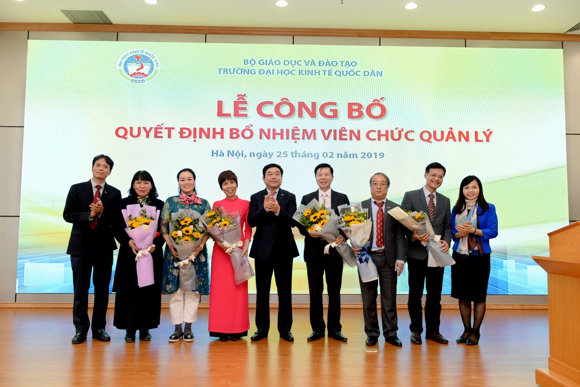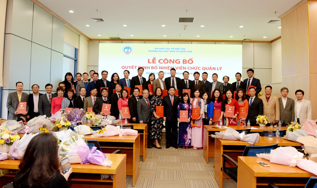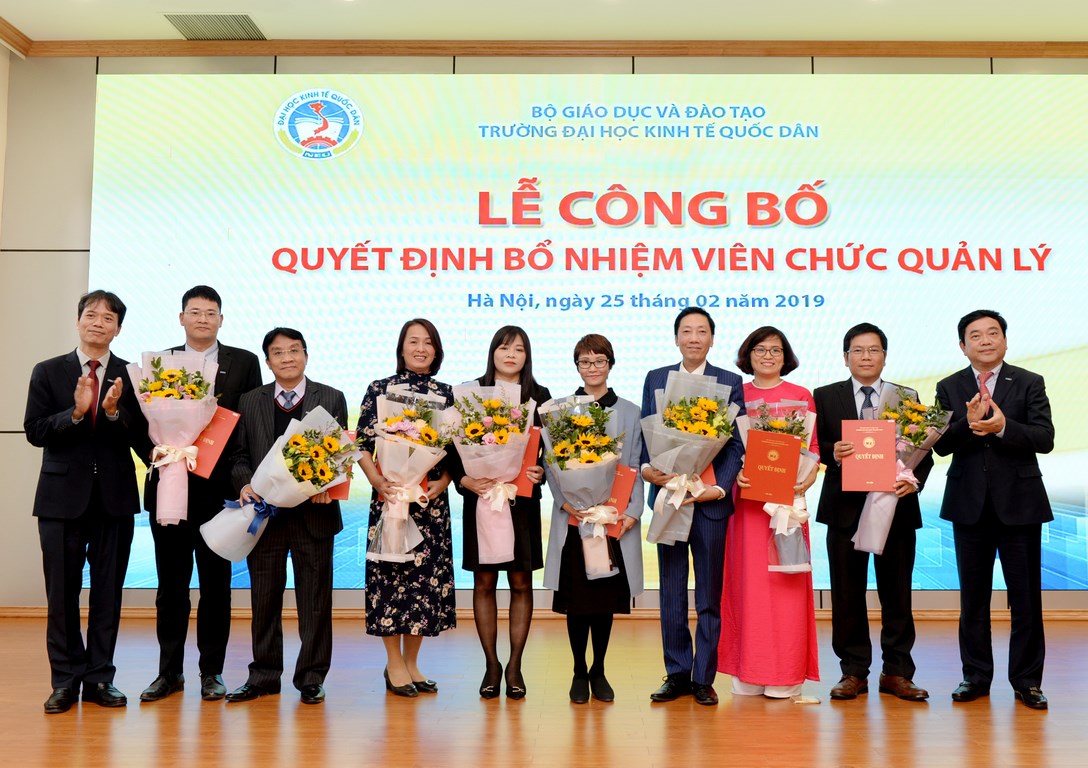 Tiếp tục thực hiện công tác kiệntoàn về bộ máy viên chức quản lý của Nhà trường và thực hiện Kế hoạch số 1842/KH-ĐHKTQD ngày 21/12/2018 về việc bổ nhiệm, bổ nhiệm lại, kéo dài thời gian giữ chức vụ, luân chuyển, cho thôi giữ chức vụ và miễn nhiệm viên chức quản lý của Trường Đại học Kinh tế Quốc dân nhiệm kỳ 2019 – 2024. Chiều ngày 25/02/2019, Trường Đại học Kinh tế Quốc dân đã tổ chức Lễ công bố quyết định bổ nhiệm cán bộ quản lý cho 27 viên chức quản lý được bổ nhiệm lần đầu, bổ nhiệm lại và các viên chức được kéo dài thời gian giữ chức vụ và tri ân các viên chức thôi giữ chức vụ quản lý.