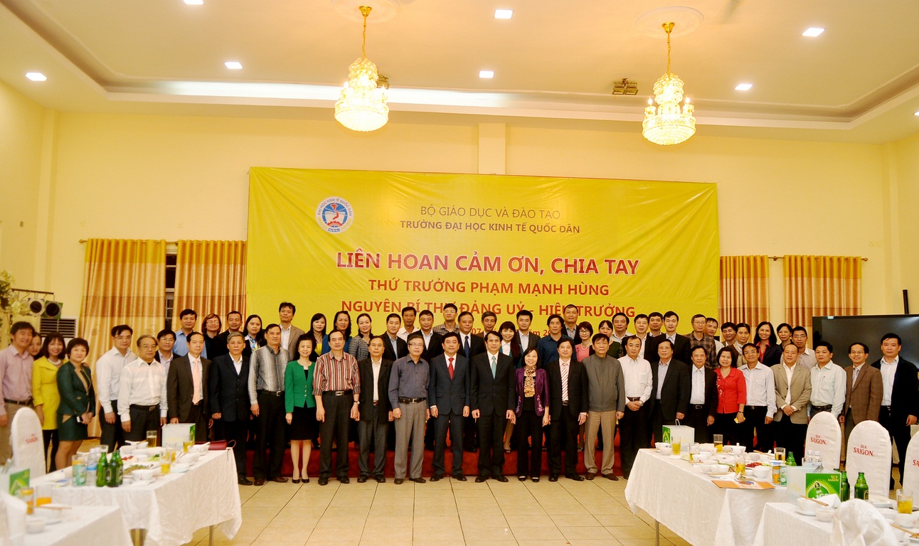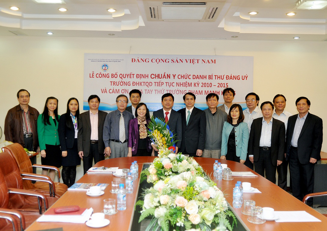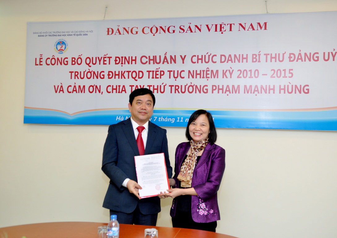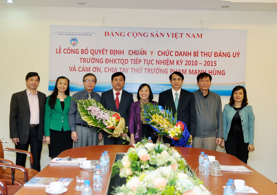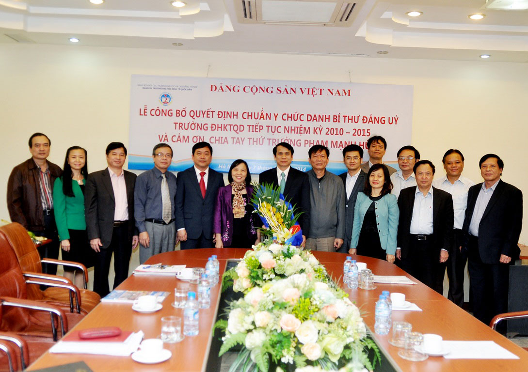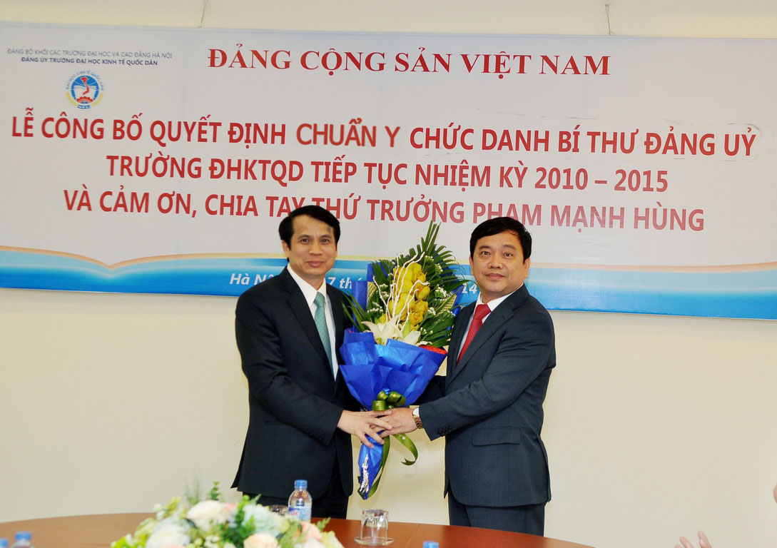 Buổi Lễ công bố Quyết định chuẩn y chức danh Bí thư BCH Đảng bộ Trường tiếp tục Nhiệm kỳ 2010 – 2015 đối với Đồng chí Trần Thọ Đạt và cảm ơn, chia tay Thứ trưởng PGS.TS Phạm Mạnh Hùng được diễn ra vào chiều ngày 7 tháng 11 năm 2014 tại Gác 2, Nhà 7 trong không khí trang trọng, thân mật và ấm áp. Đến dự buổi lễ có: PGS.TS Phạm Mạnh Hùng – Thứ Trưởng Bộ GD&ĐT, nguyên Bí thư Đảng ủy, Hiệu trưởng Nhà trường; Đồng chí Nguyễn Thị Hường – Bí thư Đảng ủy Khối các Trường ĐH,CĐ Hà Nội; Đồng chí Vũ Tuấn Dũng; Phó Bí thư TT; Đồng chí Nguyễn Tố Quyên – Trưởng BTC. Về phía Trường ĐH Kinh tế Quốc dân có GS.TS Trần Thọ Đạt – Bí thư Đảng uỷ, Hiệu trưởng cùng các đồng chí trong Đảng ủy và Ban Giám hiệu.