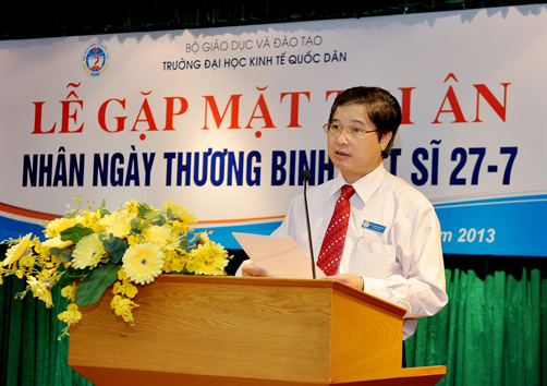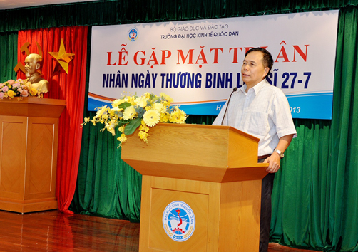 Thay mặt cho Hội Cựu chiến binh nhà trường, GS.TS.Hoàng Ngọc Việt đã phát biểu, bày tỏ sự cảm ơn sâu sắc tới các thế hệ Lãnh đạo, cán bộ, công nhân viên trong trường đã quan tâm tới đời sống của các thương binh, gia đình liệt sĩ, tạo mọi điều kiện cho các đồng chí thương binh công tác; đặc biệt hàng năm, nhà trường luôn gửi thư thăm hỏi và động viên tới các gia đình liệt sĩ và các đồng chí thương binh của trường. Chính sự quan tâm, động viên của các thế hệ lãnh đạo, cán bộ nhà trường trong nhiều năm qua đã giúp các đồng chí thương binh, người thân các gia đình liệt sĩ vươn lên hoàn thành nhiệm vụ, cùng động viên nhau cố gắng góp sức cùng tập thể sư phạm nhà trường phấn đấu xây dựng mái trường Đại học Kinh tế Quốc dân ngày một phát triển hơn.