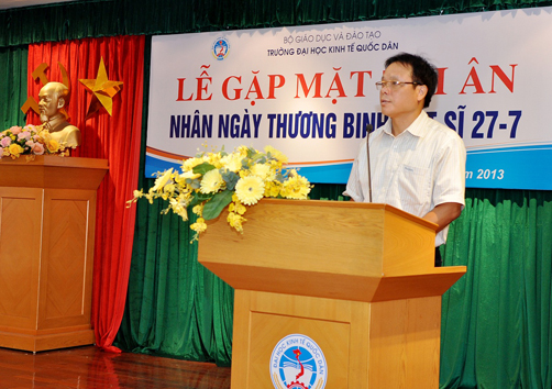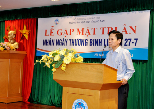 Thay mặt cho Hội Cựu chiến binh nhà trường, GS.TS.Hoàng Ngọc Việt đã phát biểu, bày tỏ sự cảm ơn sâu sắc tới các thế hệ Lãnh đạo, cán bộ, công nhân viên trong trường đã quan tâm tới đời sống của các thương binh, gia đình liệt sĩ, tạo mọi điều kiện cho các đồng chí thương binh công tác; đặc biệt hàng năm, nhà trường luôn gửi thư thăm hỏi và động viên tới các gia đình liệt sĩ và các đồng chí thương binh của trường. Chính sự quan tâm, động viên của các thế hệ lãnh đạo, cán bộ nhà trường trong nhiều năm qua đã giúp các đồng chí thương binh, người thân các gia đình liệt sĩ vươn lên hoàn thành nhiệm vụ, cùng động viên nhau cố gắng góp sức cùng tập thể sư phạm nhà trường phấn đấu xây dựng mái trường Đại học Kinh tế Quốc dân ngày một phát triển hơn.