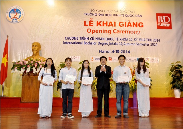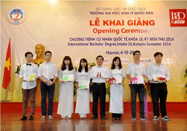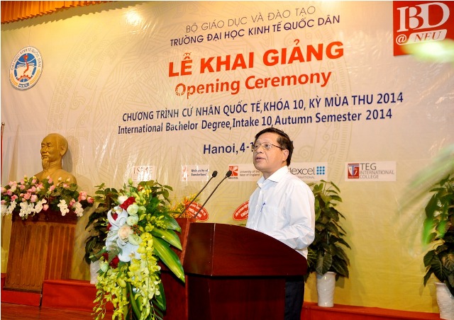 Sáng ngày 04/10, tại Nhà Văn hóa, Trường Đại học Kinh tế Quốc dân đã long trọng tổ chức Lễ khai giảng Chương trình Cử nhân Quốc tế IBD@NEU khóa 10 mùa thu 2014. Tới tham dự buổi lễ, về phía Bộ Giáo dục và Đào tạo có: Ông Phạm Chí Cường – Phó Vụ trưởng Vụ Hợp tác quốc tế, Bộ GD&ĐT; về phía trường Đại học Kinh tế Quốc dân: GS.TS. Trần Thọ Đạt – Hiệu trưởng Trường Đại học KTQD, GS.TS. Phan Công nghĩa – Phó Hiệu trưởng, GS.TS Hoàng Văn Hoa – Viện trưởng Viện ĐTQT, GS.TS. Nguyễn Quang Dong – Trưởng phòng Quản lý đào tạo, đại diện lãnh đạo các đơn vị, các tổ chức chính trị, cán bộ Viện ĐTQT, đại diện Ban phụ huynh và 224 tân sinh viên khóa 10 của chương trình cử nhân quốc tến IBD@NEU.
