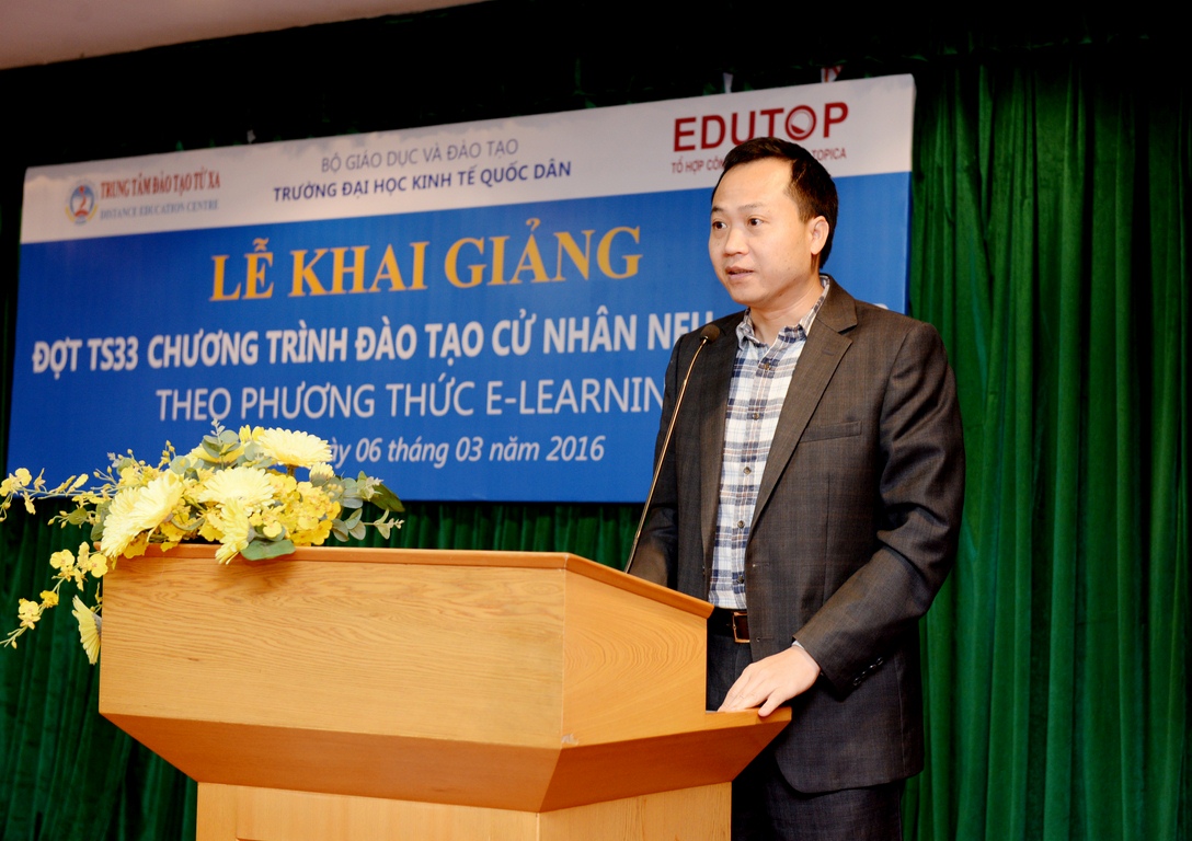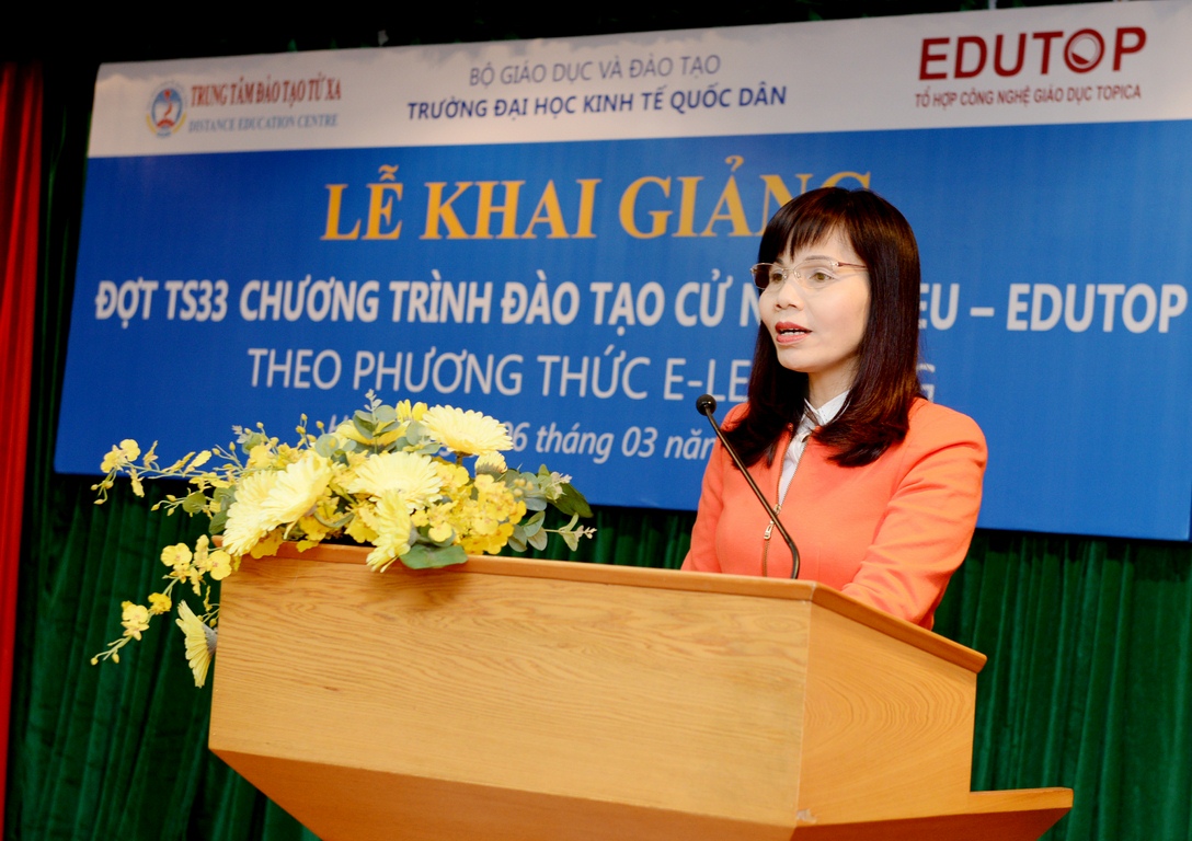 Phát biểu tại buổi lễ, PGS.TS. Trần Thị Vân Hoa nhiệt liệt chúc mừng các tân sinh viên đã trúng tuyển vào chương trình. Phó Giáo sư Phó Hiệu trưởng cũng khẳng định, qua những thành tựu và sự phát triển nhanh chóng của công nghệ thông tin, Elearning đã trở thành một xu hướng phát triển mới trong lĩnh vực giáo dục. Chỉ sau một thời gian ngắn phát triển, chương trình đào tạo cử nhân trực tuyến NEU-EDUTOP đã thu hút hơn 6.500 học viên theo học. Và hôm nay, chương trình tiếp tục tổ chức khai giảng đợt TS33 năm 2016 tại Hà Nội. Phó Hiệu trưởng nhấn mạnh, Nhà trường, Trung tâm đào tạo từ xa và Công ty EDUTOP64 sẽ phối hợp một cách chặt chẽ, tạo mọi điều kiện thuận lợi nhất để các sinh viên học tập tốt. Nhà trường cũng mong muốn rằng các sinh viên phải luôn có ý chí quyết tâm, chủ động về thời gian, tiến độ học tập của mình để vừa hoàn thành nhiệm vụ tại cơ quan công tác, hoàn thành nhiệm vụ tại gia đình và hoàn thành nhiệm vụ học tập theo yêu cầu của chương trình.