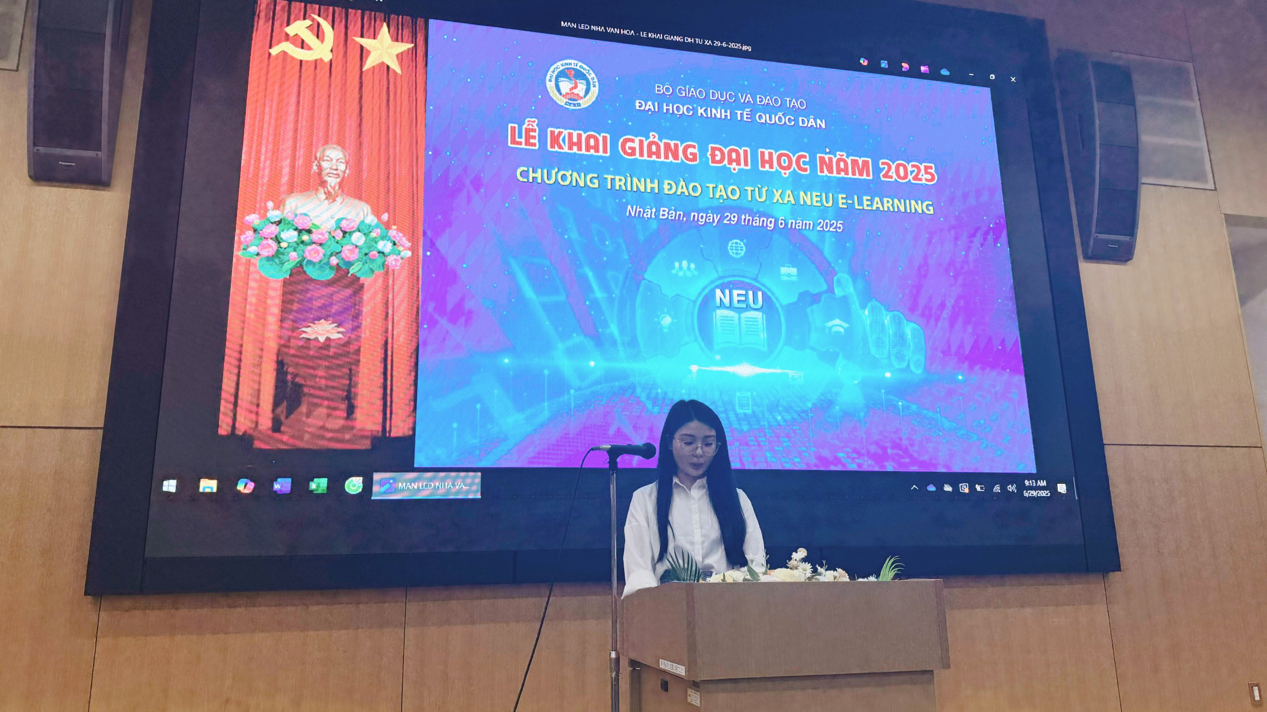 Đại diện cho các tân sinh viên của Chương trình NEU E-learning khóa 2 của Đại học Kinh tế Quốc dân tại Nhật Bản, sinh viên Hoàng Thị Thảo Vân bày tỏ niềm tự hào và vinh dự khi được phát biểu tại Lễ khai giảng ngày hôm nay, cũng như được thay mặt toàn thể tân sinh viên gửi lời cảm ơn chân thành đến Ban Giám hiệu Đại học, quý thầy cô và các đơn vị phối hợp đã mang đến một chương trình học tập thiếtthực, ý nghĩa dành riêng cho cộng đồng người Việt Nam đang sinh sống, học tập và làm việc tại Nhật Bản.