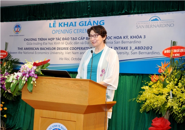 Thay mặt cho trường đối tác, Tiến sĩ Tatiana Karmanova – Viện trưởng Viện trưởng Viện Quản trị kinh doanh – đại học  California – San Bernardino – Hoa Kỳ đã đánh giá cao sự nỗ lực của các tân sinh viên, sự tin tưởng của các vị phụ huynh đã quyết định gửi con, em mình học chương trình này. Tiến sĩ cho biết trường Đại học California State University, San Bernardino (CSUSB) là trường đại học đại diện cho hệ thống đại học công lập lớn nhất tại Hoa Kỳ. Chương trình đào tại cử nhân quản trị của trường đã được đánh giá và kiểm định bởi AACSB – một tổ chức kiểm định uy tín nhất của Hoa Kỳ cũng như trên thế giới. Theo đánh giá xếp  hạng gần đây nhất, CSUSB đứng ở “top” 4% các trường đại học trên toàn quốc. Năm nay, dựa trên tiêu chuẩn mới của chính phủ về chất lượng đầu ra và chi phí hợp lý, tạp chí Times đã xếp hạng các trường đại học tại Hoa Kỳ, CSUSB đã đứng ở vị trí thứ 30, thậm chí là một bậc cao hơn cả Đại học Havard. Theo thông tin từ báo “US News and Worlds Report” và “Princeton Review” thì CSUSB luôn ổn định trong “top” những trường đại học công lập tốt nhất. Cũng theo danh sách  “Những trường đại học tốt nhất nước Mỹ” được công bố bởi Forbes, và “ Những trường đại học tuyệt vời nhất nước Mỹ” theo tạp chí Sierra, CSUSB cũng có tên trong danh sách này. Vào năm 2012, tạp chí Washington Monthly đã đưa ra đánh giá về trình độ đào tạo bậc cao học, và CSUSB đã đứng thứ 19 toàn quốc. Đánh giá này dựa trên cơ sở đóng góp của trường đối với xã hội theo 3 tiêu chí: tính linh hoạt, nghiên cứu khoa học và dịch vụ. Trường đã nhận được Giải thưởng danh dự  của Tổng thống về giáo dục đại học cho cộng đồng, giải thưởng vì công dân của Tổ chức giáo dục Washington Center’s Higher Education và hạng mục vì cộng đồng của Carnegie. Đặc biệt là năm nay, chương trình thạc sỹ quản trị kinh doanh của CSUSB đã đứng thứ 20 theo đánh giá của Diễn đàn giáo dục quốc tế của  CEO Magazine. Tiến sĩ cho rằng việc học 2 năm tại Việt Nam đã giúp cho sinh viên tiết kiệm được đến 40% chi phí đào tạo so với học tại Hoa Kỳ nhưng vẫn nhận được chất lượng tương đương như học đại học tại Hoa Kỳ. Tiến sĩ hy vọng rằng các em sinh viên sẽ vượt qua những thử thách phía trước, các em sẽ dành được những thành quả lớn. Các em sẽ trở thành những công dân toàn cầu thực thụ với một nền tảng tri thức vững trãi và dày dạn kinh nghiệm thực tế. Các em sẽ được chuẩn bị để sẵn sàng cho bất sự cạnh tranh nào ở bất cứ đâu. Chương trình này sẽ không chỉ giúp cho các em cống hiến cho xã hội mà còn định hình xã hội bởi việc trở thành nhà lãnh đạo.