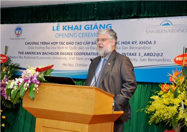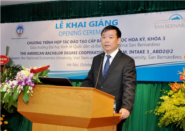Phát biểu khai giảng, GS.TS Trần Thọ Đạt – Hiệu trưởng Nhà trường đã chúc mừng các tân sinh viên đã hoàn thành xuất sắc kỳ thi tuyển sinh và trúng tuyển vào khóa thứ ba của Chương trình. Thay mặt Đảng ủy, Ban Giám Hiệu nhà trường GS.TS Trần Thọ Đạt khẳng định việc hợp tác đào tạo với các trường đại học có chất lượng và danh tiếng trên thế giới, đặc biệt là các trường đại học của Hoa Kỳ là một trong những hướng phát triển của Nhà trường trong tiến trình hội nhập quốc tế ngày càng sâu rộng. Giáo sư mong muốn sự hợp tác giữa đại học Kinh tế quốc dân với các trường đại của Hoa Kỳ sẽ ngày càng được tăng cường và đóng góp vào sự phát triển hợp tác đào tạo cũng như phát triển tình hữu nghị giữa hai nhà nước, đồng thời GS cũng gửi lời cám ơn đối với Ngài Terry White – Tham tán thông tin văn hóa – Đại sứ quán Hoa Kỳ đã đến tham dự lễ khai giảng và qua Ngài, Giáo sư gửi lời cám ơn tới nhân viên Đại Sứ quán Hoa Kỳ tại Việt Nam đã tạo cơ hội cho sinh viên của Chương trình được trao đổi và học hỏi về văn hóa Hoa Kỳ. Cũng trong lễ khai giảng, Giáo sư đã chúc mừng thành công bước đầu khi có 100% số sinh viên khóa 1 đã được nhận VISA sang học tại Hoa Kỳ và tin tưởng các khóa tiếp theo sẽ tiếp tục được nhận VISA đầy đủ, đúng thời gian để tiếp tục hoàn thành chương trình khoa học tại Hoa Kỳ.