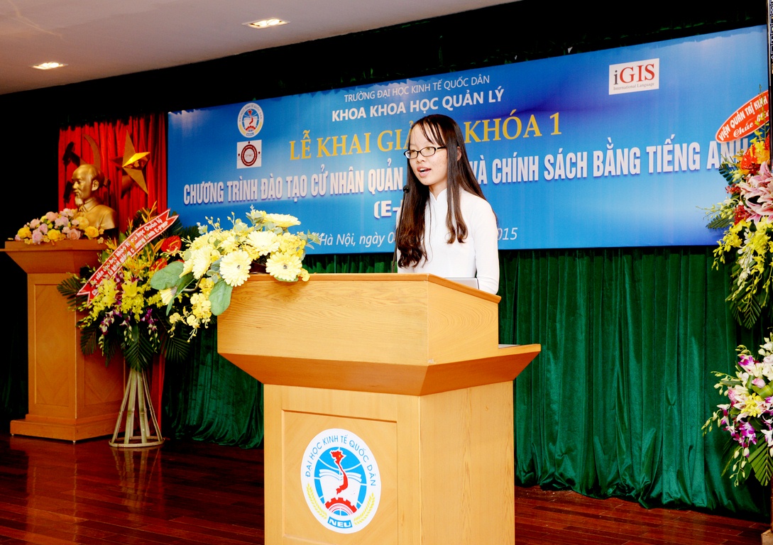 Trong niềm vui, xúc động, sinh viên Vũ Ngọc Anh đã phát biểu trân trọng cảm ơn GS.TS Trần Thọ Đạt – Hiệu trưởng, Bí thư Đảng ủy cùng tập thể sư phạm nhà trường đã tạo điều kiện tốt nhất để chúng em có được kết quả bước đầu rất đáng khích lệ như ngày hôm nay. Sinh viên Vũ Ngọc Anh thay mặt các ban sinh viên, xin được lĩnh hội những căn dặn, chỉ bảo của Thầy Hiệu trưởng phát biểu tại buổi lễ, để tập thể lớp E-PMP sẽ là một tập thể gắn kết, hòa nhập nhanh với môi trường học tập và hứa với quyết tâm nỗ lực cao nhất của bản thân sẽ hoàn thành xuất sắc khóa học để được cầm tấm bằng danh giá của Đai học Kinh tế Quốc dân. Thay mặt cho sinh viên E-PMP, Sinh viên Vũ Ngọc Anh đã kính tặng những bó hoa tươi thắm nhất đến các Thầy Cô lãnh đạo Nhà trường.