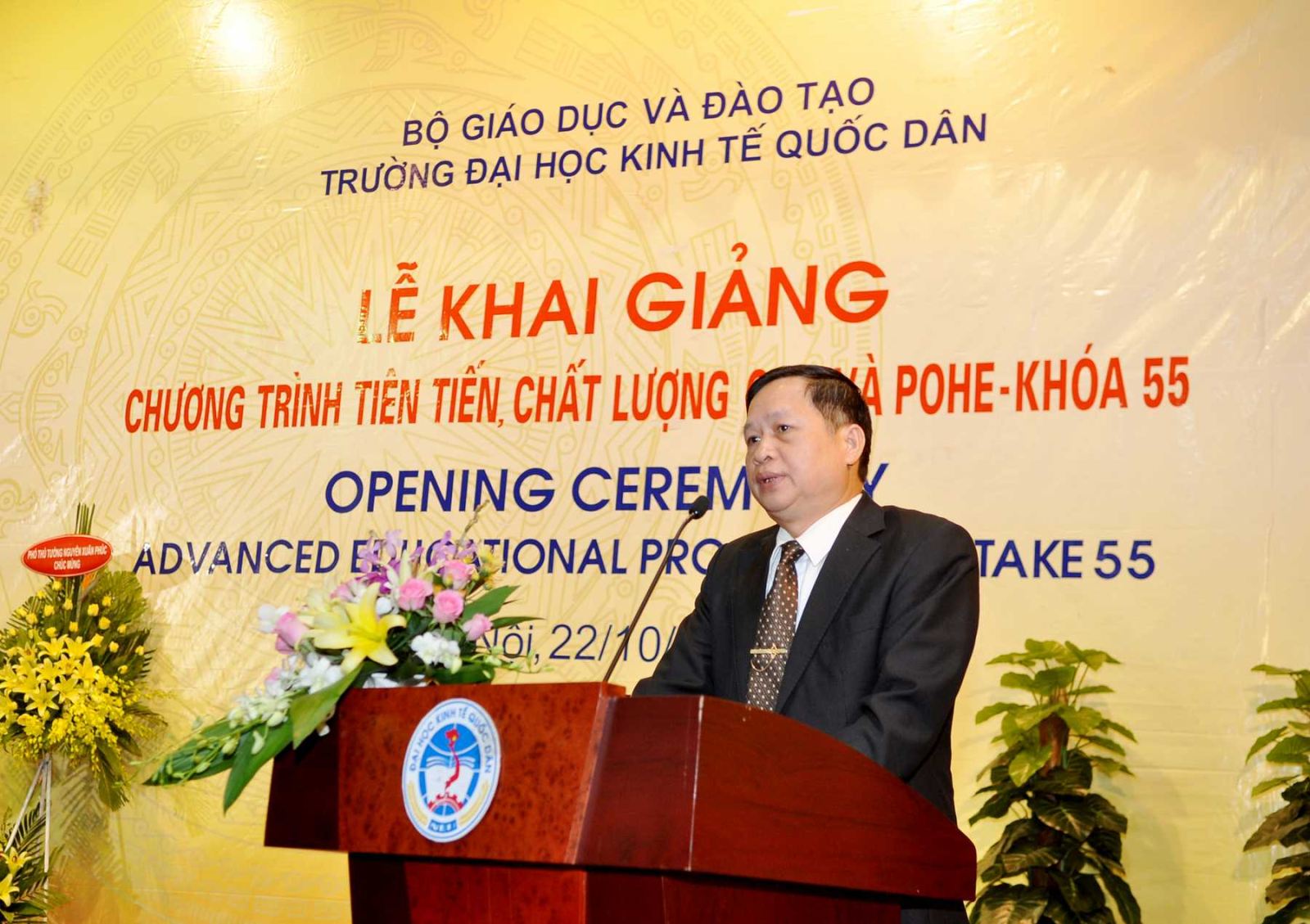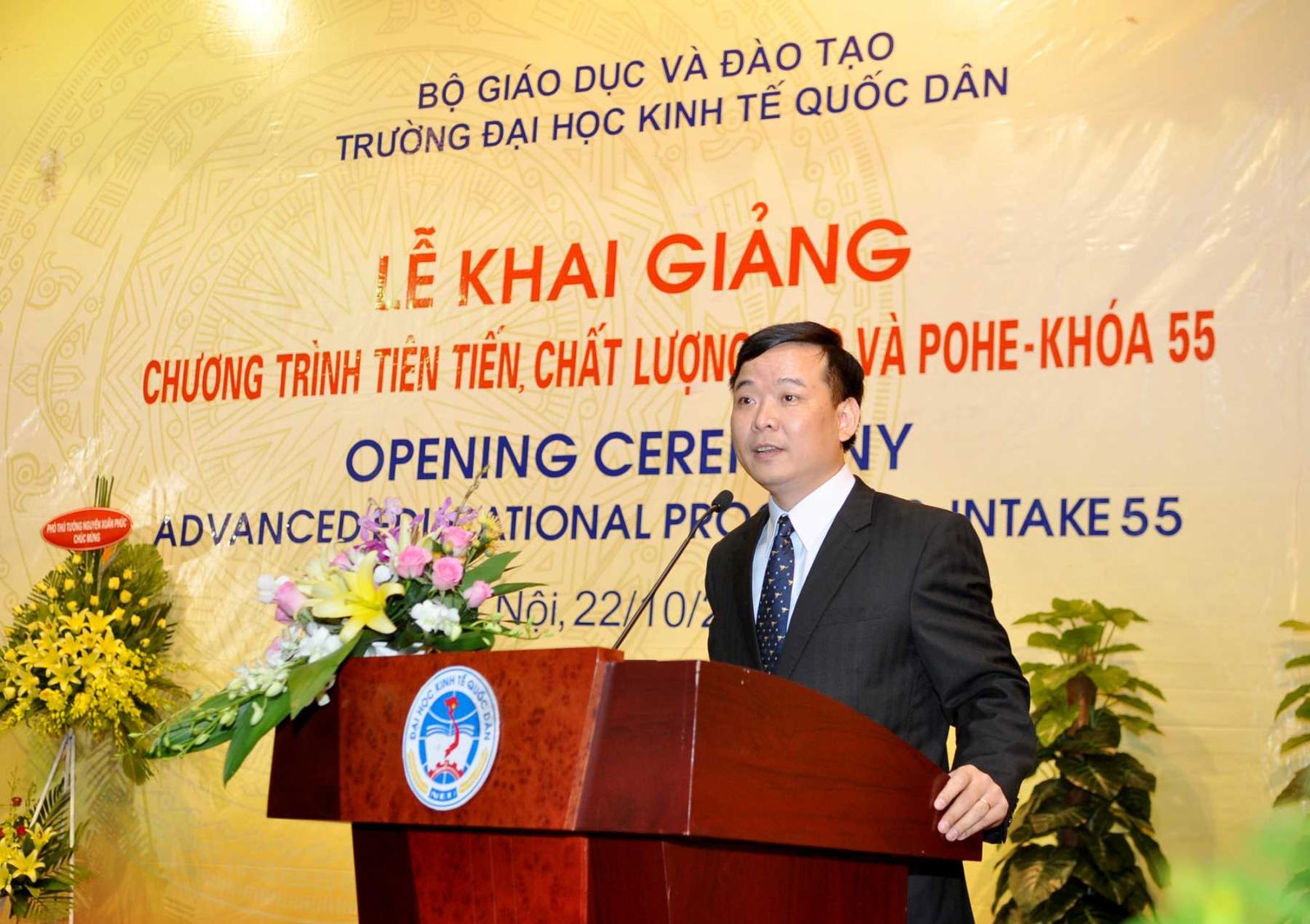 Phát biểu tại buổi lễ, GS.TS.Phạm Quang Trung – Phó Hiệu trưởng đã nhiệt liệt chúc mừng hơn 650 sinh viên đã vượt qua 2 kỳ thi tuyển đầy cam go, quyết liệt để trở thành những tân sinh viên khóa 55 Chương trình Tiên tiến, chất lượng cao và POHE. Đánh giá về vai trò và vị trí của Chương trình, GS. Phạm Quang Trung khẳng định: Năm học 2013 – 2014 tiếp tục đánh dấu sự phát triển của Chương trình qua việc số lượng sinh viên đăng ký và trúng tuyển với hơn 650 sinh viên. Điều đó minh chứng cho sức hút ngày càng lớn của Chương trình Tiên tiến, Chất lượng cao và POHE – một trong những chương trình đào tạo có chất lượng tốt nhất hiện nay của ĐH Kinh tế Quốc dân. Năm học 2013 – 2014 là năm thứ 7 triển khai thực hiện Chương trình tiên tiến và là năm thứ 4 đối với Chương trình Chất lượng cao tại ĐH Kinh tế Quốc dân. Trong suốt quá trình đào tạo, Lãnh đạo nhà trường đã luôn quan tâm chỉ đạo sát sao trong việc xây dựng và hoàn thiện chương trình đào tạo, giáo trình học liệu, phương pháp giảng dạy, cách thức quản lý…Nhờ đó Chương trình Tiên tiến của Đại học Kinh tế Quốc dân hiện nay đang được xếp trong top Chương trình Tiên tiến hàng đầu cả nước, chất lượng đào tạo đã dần được xã hội công nhận, đang góp phần quan trọng vào quá trình đổi mới và nâng cao chất lượng đào tạo của Nhà trường. GS. Phạm Quang Trung cũng đề nghị các Thầy Cô giáo, đội ngũ cán bộ quản lý của Chương trình tiếp tục tìm tòi, nghiên cứu, đổi mới phương pháp giảng dạy và quản lý để ngày càng nâng cao chất lượng đào tạo Chương trình Tiên tiến,Chất lượng cao và POHE; đồng thời cũng gửi đến sinh viên của Chương trình tiếp tục vượt qua khó khăn và thử thách, phát huy được nhiệt huyết của tuổi trẻ, sự say mê, sáng tạo trong học tập, tăng cường rèn luyện phẩm chất đạo đức để trở thành những người có đủ năng lực, phẩm chất góp phần vào xây dựng đất nước sau này.