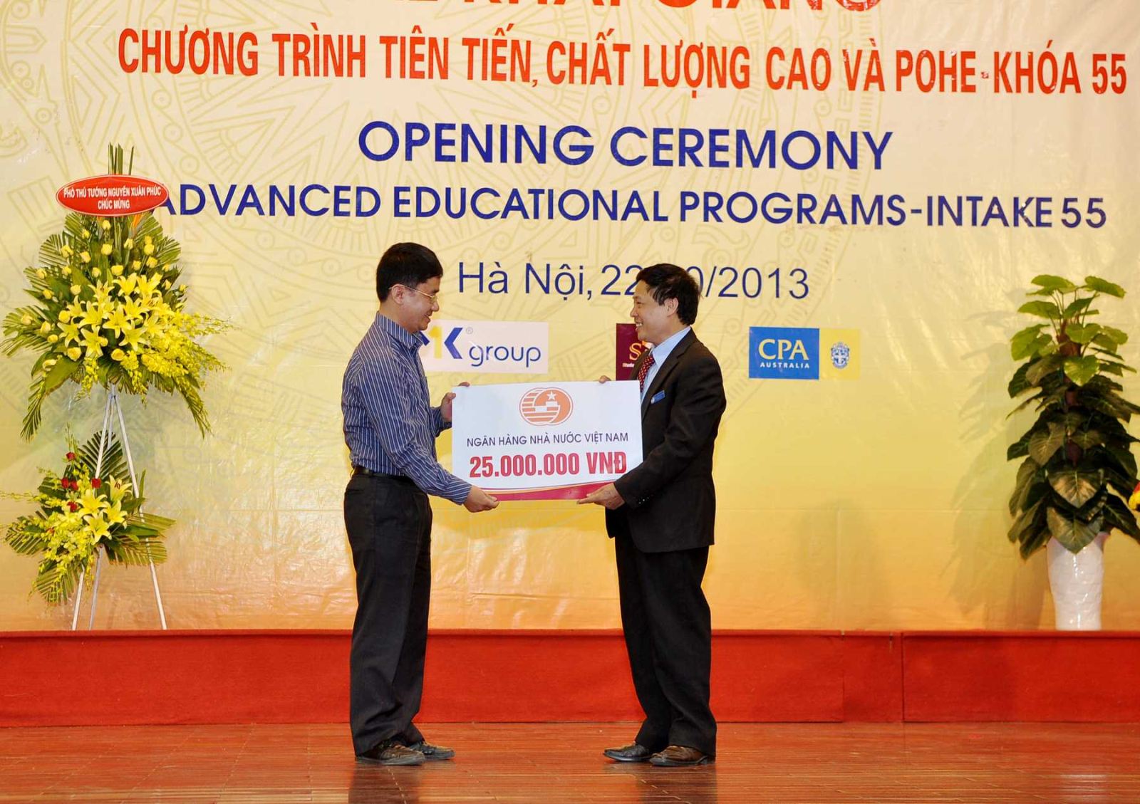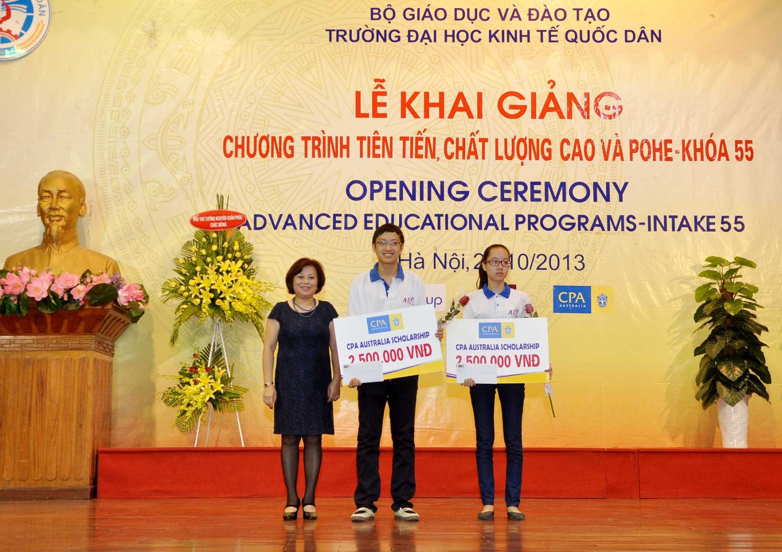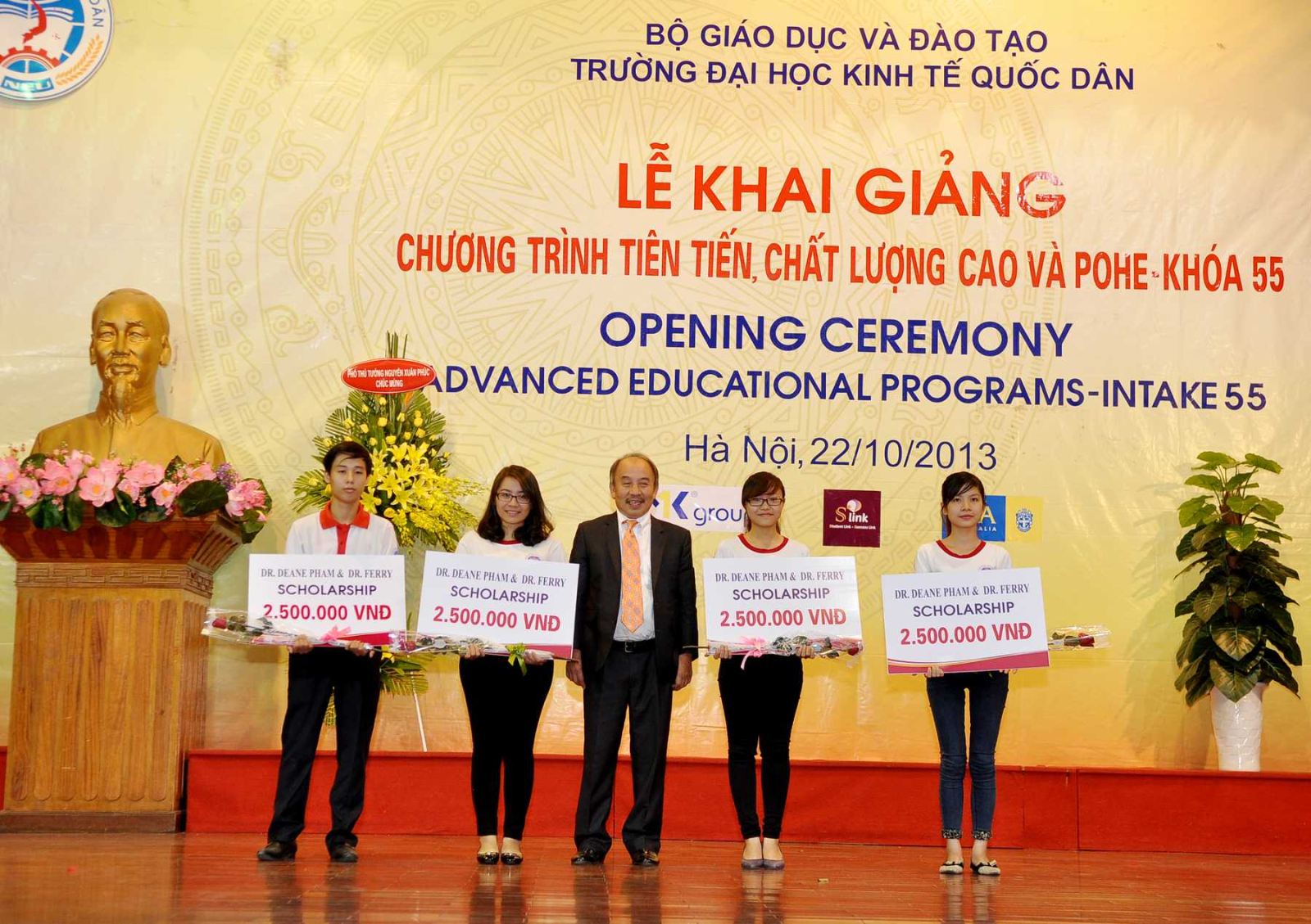 Nhân dịp này, nhằm động viên và khích lệ tinh thần học tập của các tân sinh viên, Hiệu trưởng đã quyết định khen thưởng cấp họ bổng cho 6 sinh viên Chương trình Tiên tiến, chất lượng cao & POHE có thành tích hoạt động và học tập xuất sắc trong năm học 2012- 2013. Đồng thời, một số nhà tài trợ đã đến dự và trao học bổng cho các em sinh viên. Có 68 suất học bổng được trao cho sinh viên với trị giá 235 triệu đồng (Tập đoàn công nghệ MK, Công ty CPA Australia tại Việt Nam, Công ty TNHH SLINK Việt Nam, Ngân hàng Nhà nước Việt Nam). Ngoài ra các sinh viên cũng đã nhận được học bổng của 2 giáo sư Mỹ đang giảng dạy cho Chương trình Tiên tiến, đó là GS.Deane Phạm và giáo sư Ferry.
