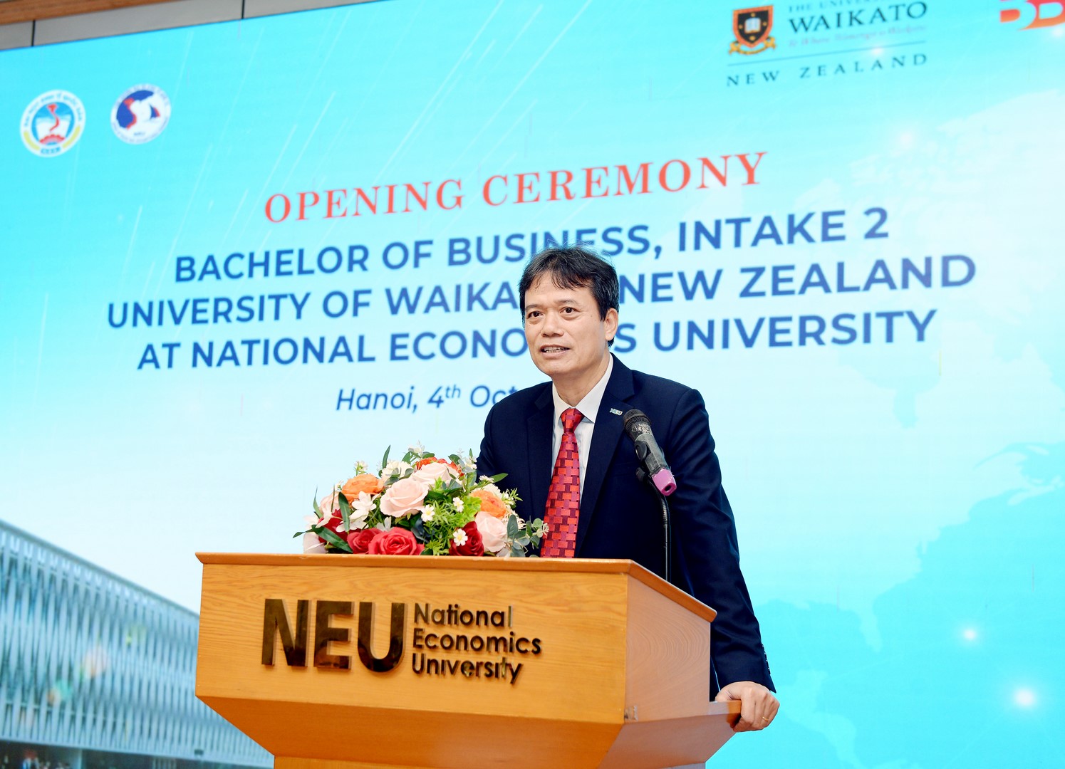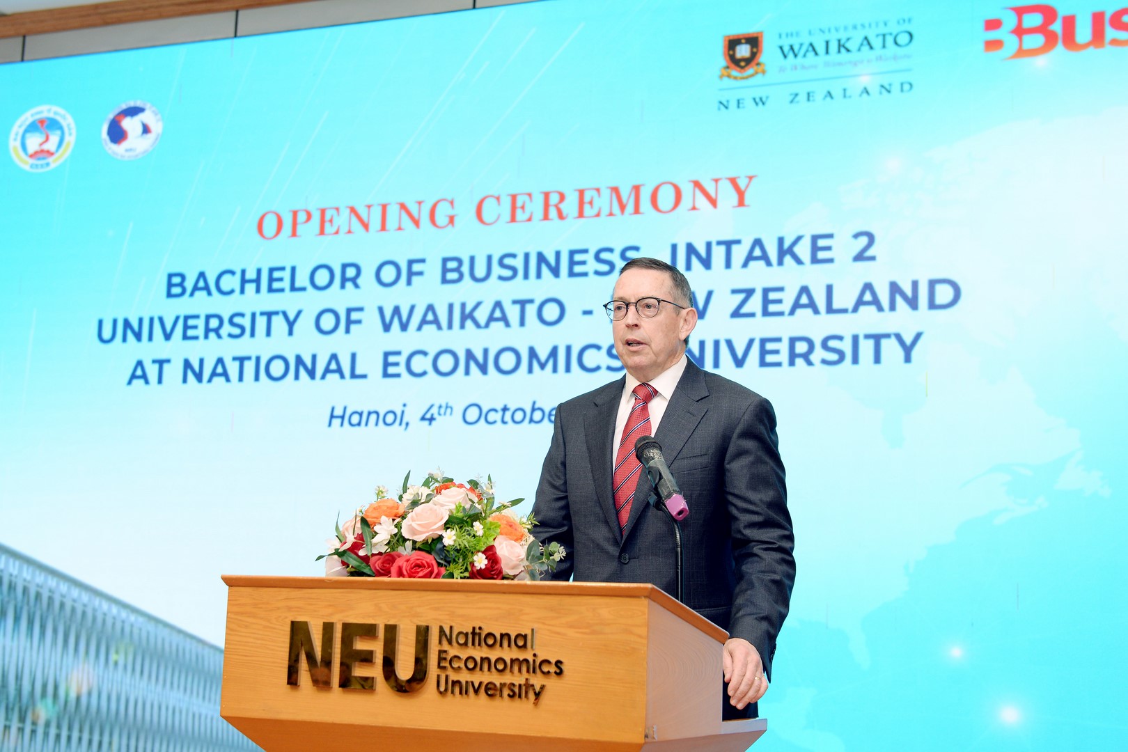 Phát biểu tại buổi Lễ, GS Neil Quigley chia sẻ, Đại học Waikato rất vinh dự đã xây dựng được mối quan hệ chặt chẽ với Đại học Kinh tế Quốc dân và chương trình liên kết đào tạo này đã mở ra một chươngmới cho sự hợp tác giữa hai bên. Chúng tôi biết rằng sinh viên Việt Nam rất chăm chỉ và sáng tạo. Chính bởi vậy, chúng tôi tin tưởng khi các em tham gia chương trình này sẽ được trải nghiệm trong một môi trường học tập khác biệt, mang đậm nét của New Zealand và nhận được tấm bằng của New Zealand trong khi vẫn có thể ở gần nhà, gần gia đình và tiếp cận được các cơ hội nghề nghiệp – GS Neil Quigley nói.
