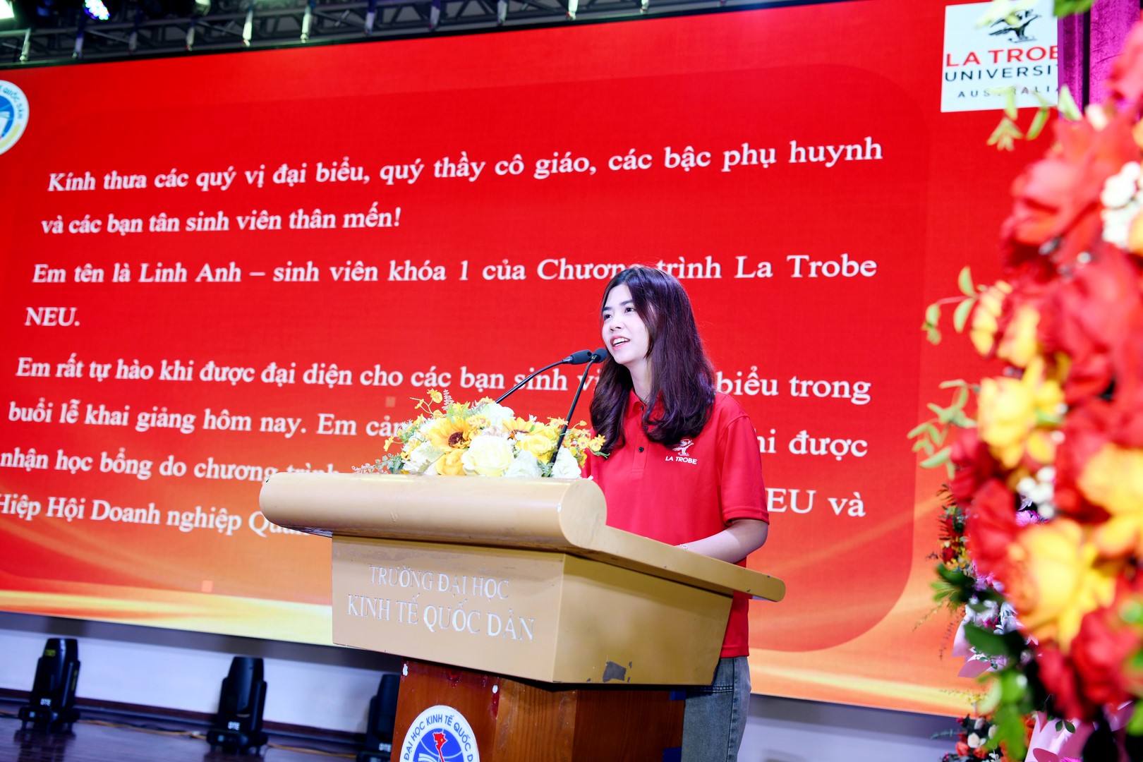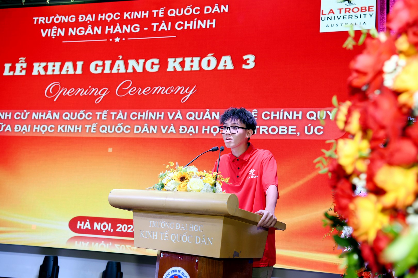 Phát biểu tại buổi lễ, tân sinh viên Lê Công Minh đã thay mặt 176 sinh viên khóa 3 La Trobe – NEU gửi lời tri ân tới các thầy cô giáo, các bậc phụ huynh có mặt trong buổi lễ khai giảng.