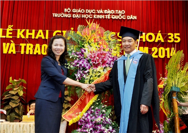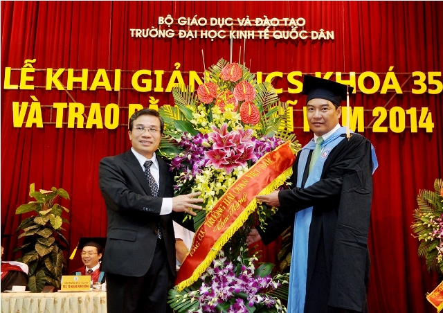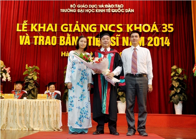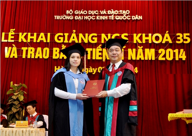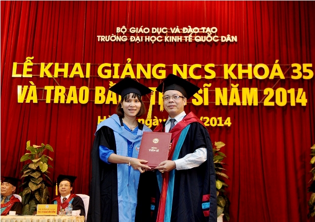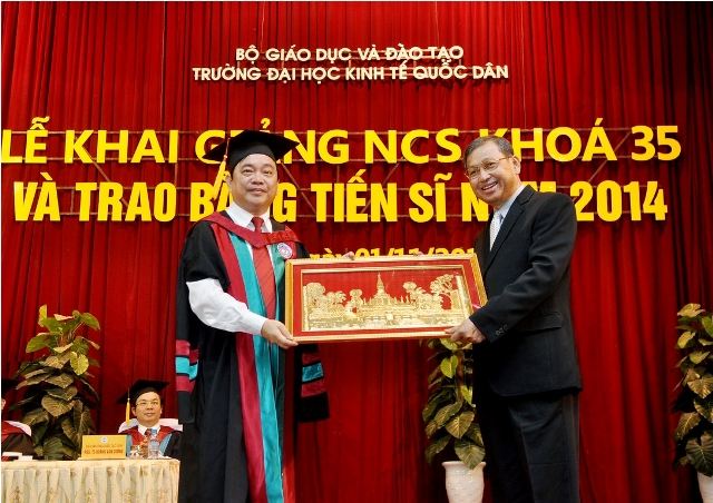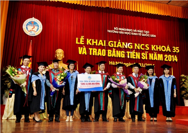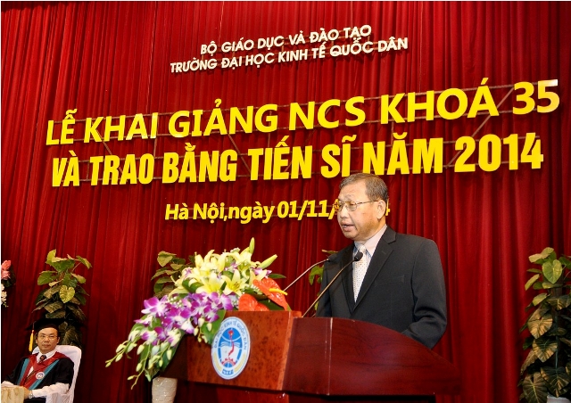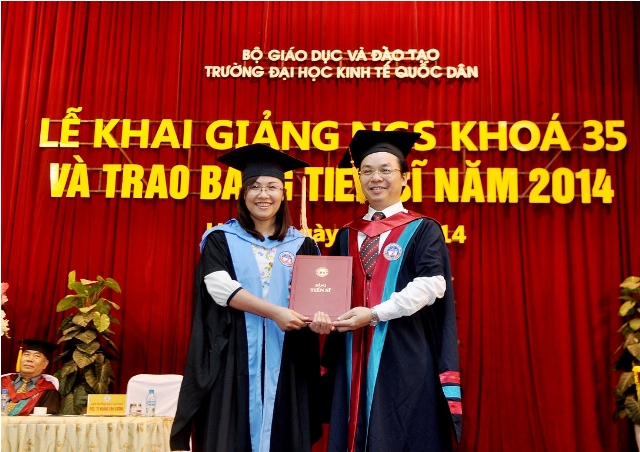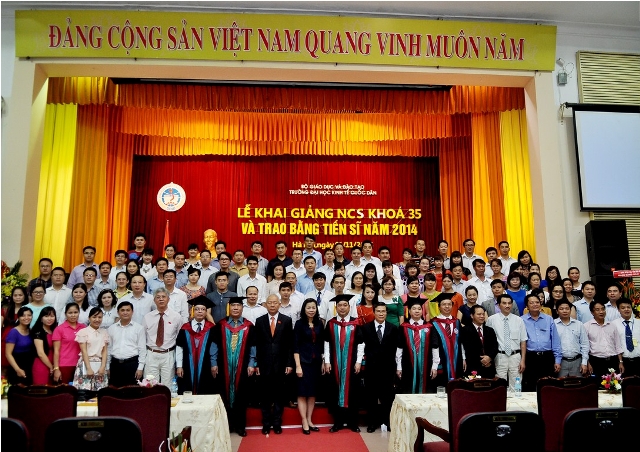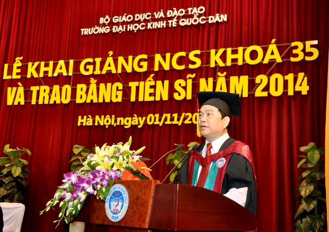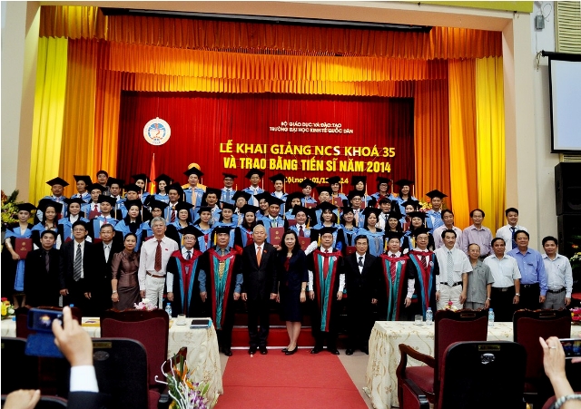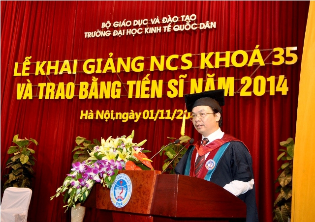 Trong không khí phấn khởi của cả nước cùng hướng tới kỷ niệm ngày ngày Nhà giáo Việt Nam 20/11, sáng 01/11/2014, tại Hội trường A, trường Đại học Kinh tế Quốc dân đã long trọng tổ chức Lễ khai giảng cho hơn 100 NCS khoá 35 và trao bằng tiến sĩ cho 45 tân Tiến sĩ năm 2014. Đến dự buổi lễ, về phía các vị khách quốc tế có: Ông Sune Detvongsa – Phó trưởng Ban Nghiên cứu Chiến lược phát triển kinh tế TW Đảng NDCM Lào; Ông Ou Savan Thieng Thatvongsa – Phó trưởng Ban Nghiên cứu Chiến lược phát triển kinh tế Đảng NDCM Lào; Bà Bun Khan Vorachit – Thứ trưởng Bộ Tài nguyên và Môi trường nước CHDCNDCM Lào; Ông Dai Lattanaphaivanh – Bí thư thứ 3 Đại sứ quán nước CHDCND Lào tại Việt Nam. Về phía các vị khách trong nước có: Bà Vũ Thị Mai – Thứ trưởng Bộ Tài chính; TS.Trần Văn – Phó Chủ nhiệm Ủy ban Tài chính ngân sách của Quốc hội; Ông Nguyễn Đức Kiên – Phó Chủ nhiệm UB Kinh tế Quốc hội; Ông Nguyễn Dương Thái – Phó Tổng Cục trưởng Tổng Cục Hải quan; Ông Khúc Văn Liên – đại diện Vụ GD & Đào tạo; Bà Đặng Thị Bình An – Nguyên Phó Tổng cục trưởng Tổng cục Hải quan. Về phía trường ĐHKTQD có GS.TS.Trần Thọ Đạt – Bí thư Đảng ủy, Hiệu trưởng; GS.TS.Phạm Quang Trung – Phó Hiệu trưởng; GS.TS Phan Công Nghĩa – Phó Hiệu trưởng; GS.TS.Nguyễn Viết Lâm – Phó Bí thư TT Đảng ủy; PGS.TS.Hoàng Văn Cường – Viện trưởng Viện Đào tạo SĐH cùng đại diện lãnh đạo các phòng, khoa, viện trong trường, các thầy cô giáo tham gia giảng dạy, các cơ quan phát thanh truyền hình, gia đình, bạn bè của các NCS, các tân Tiến sĩ.