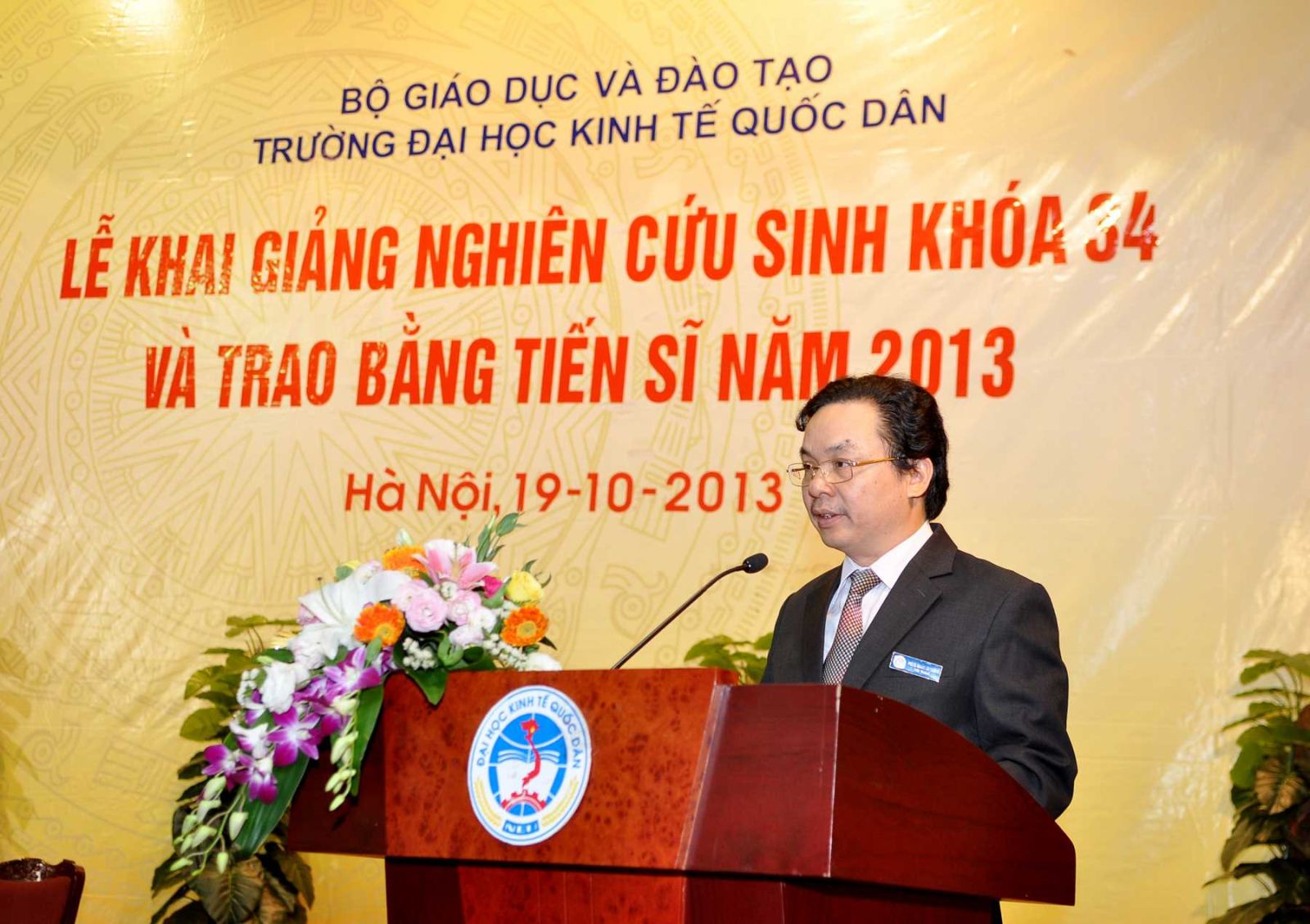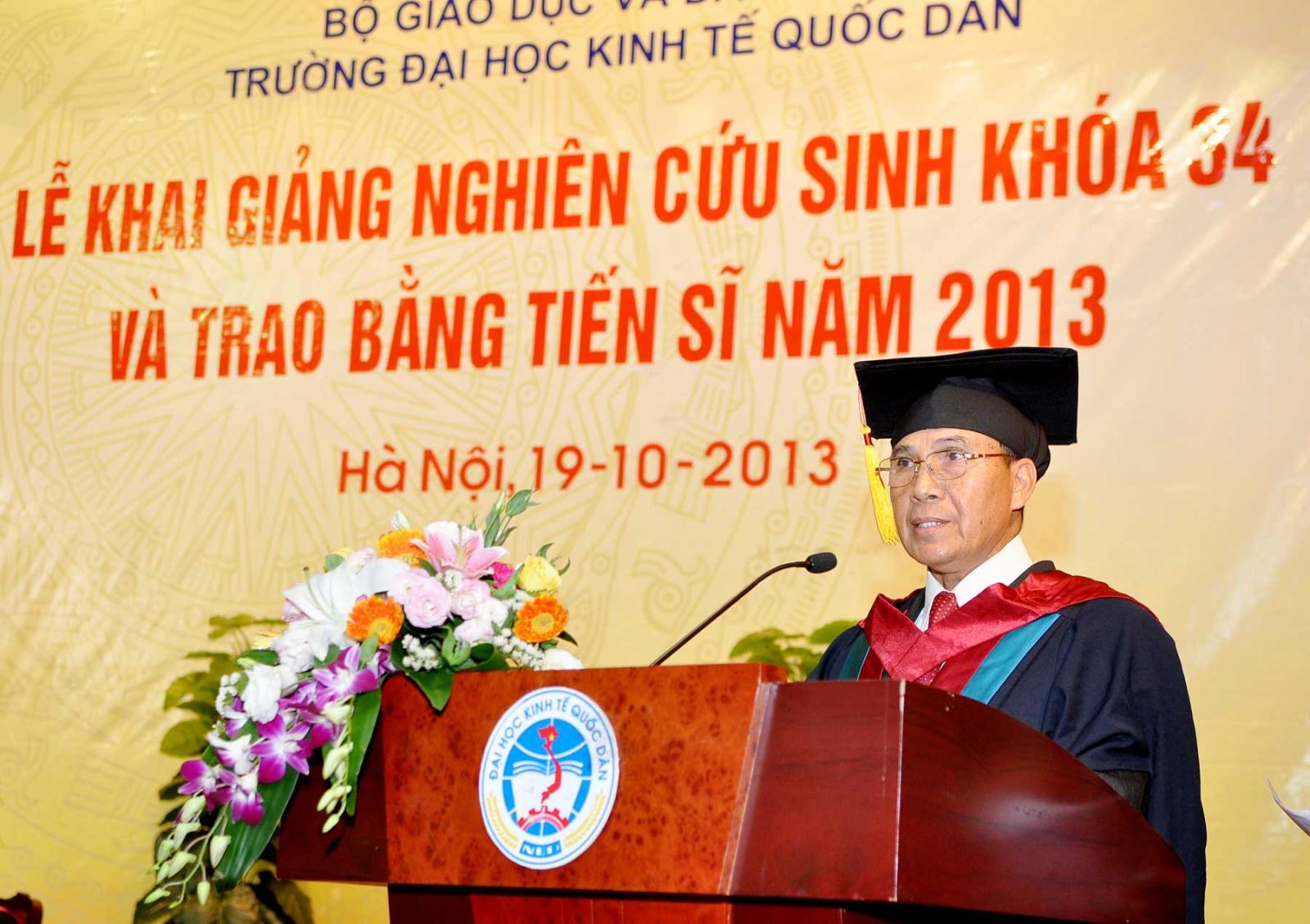Phát biểu tại buổi lễ, PGS.TS.Phạm Mạnh Hùng – Hiệu trưởng nhiệt liệt chúc mừng thành công của 67 tân Tiến sỹ (trong đó có 8 Tiến sĩ thuộc nước CHDCND Lào) và 133 tân nghiên cứu sinh khóa 34. Sau khi tổng kết thành tựu đạt được của Nhà trường về đào tạo Sau đại học gần 35 năm, trong đó có giúp đỡ nước bạn Lào về đào tạo nguồn nhân lực có chất lượng cao, Hiệu trưởng đã khẳng định Trường Đại học Kinh tế Quốc dân đã và đang là cơ sở đào tạo tiến sĩ kinh tế hàng đầu ở Việt Nam và có uy tín trong khu vực; đồng thời cảm ơn và đánh giá cao những nỗ lực và đóng góp quý báu của các GS, PGS, TS và các cán bộ quản lý, các nhà khoa học trong và ngoài trường đã góp phần làm nên thành công ngày hôm nay, đặc biệt cảm ơn sâu sắc tới Ban Giám đốc Đại học học Quốc gia Lào đã phối hợp và có những đóng góp hiệu quả vào chương trình hợp tác đào tạo sau đại họcgiữa hai trường.