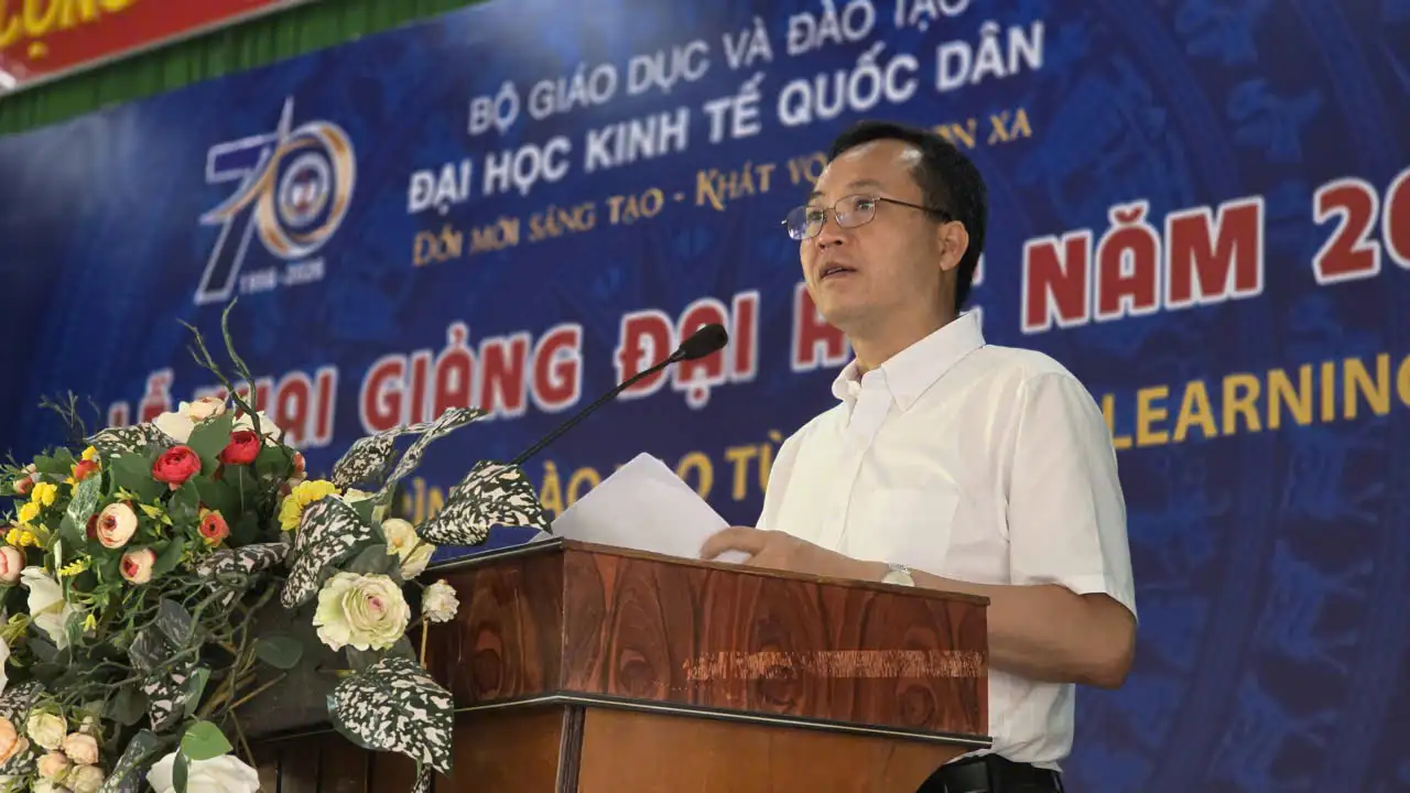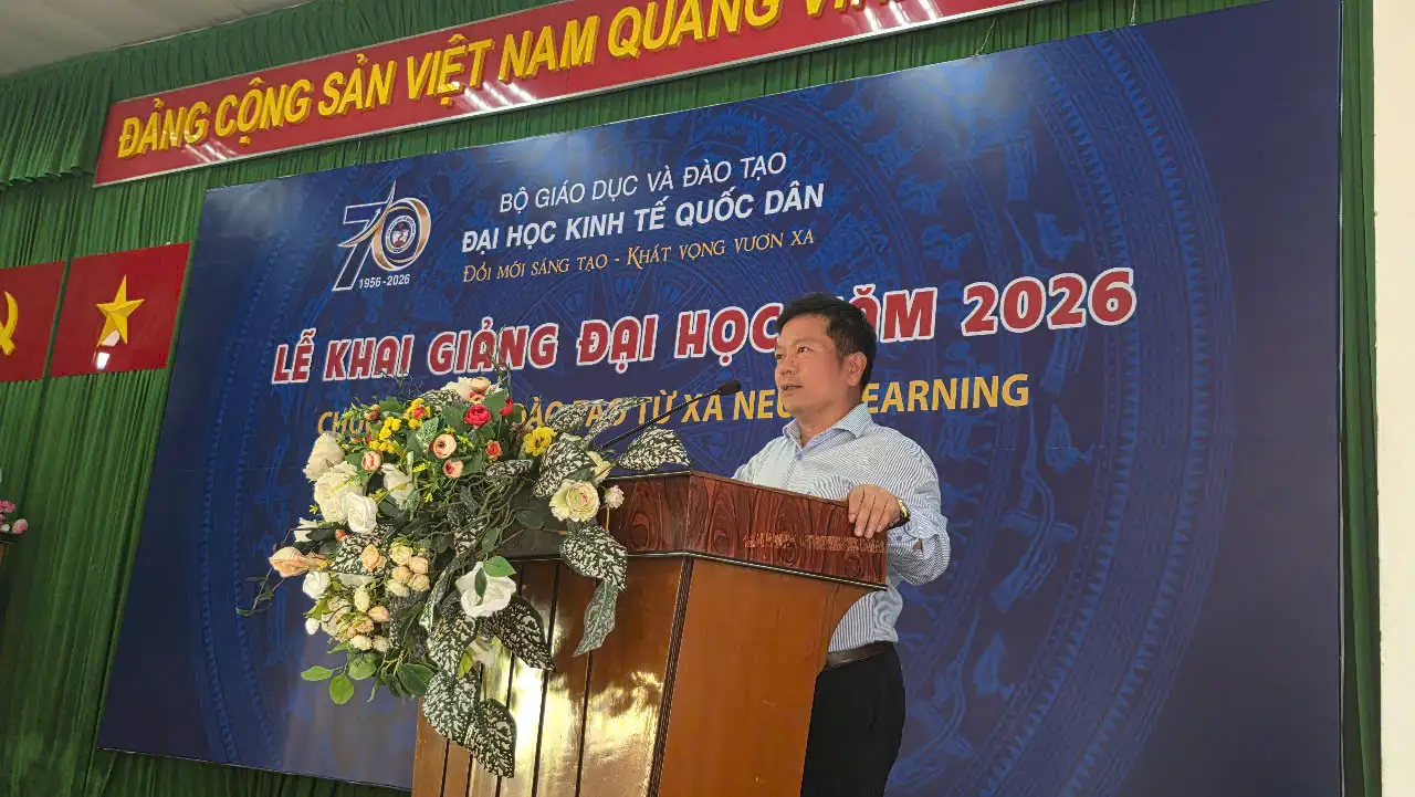 Phát biểu tại Lễ khai giảng chương trình Đào tạo từ xa trình độ đại học đợt 2 năm 2026 khu vực miền Nam, GS.TS Nguyễn Thành Hiếu – Phó Giám đốc Đại học Kinh tế Quốc dân gửi lời chúc mừng tới các bạn tân sinh viên, đồng thời bày tỏ kỳ vọng các học viên sẽ đạt được nhiều kết quả tích cực trong quá trình học tập.