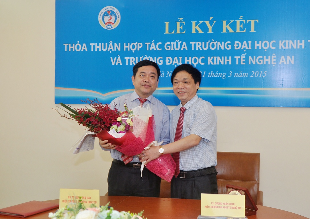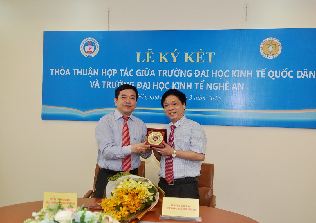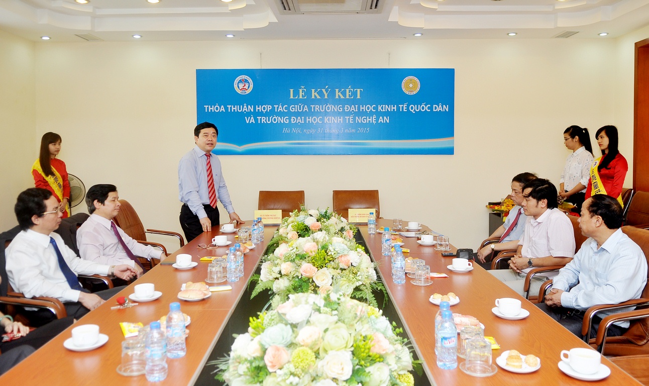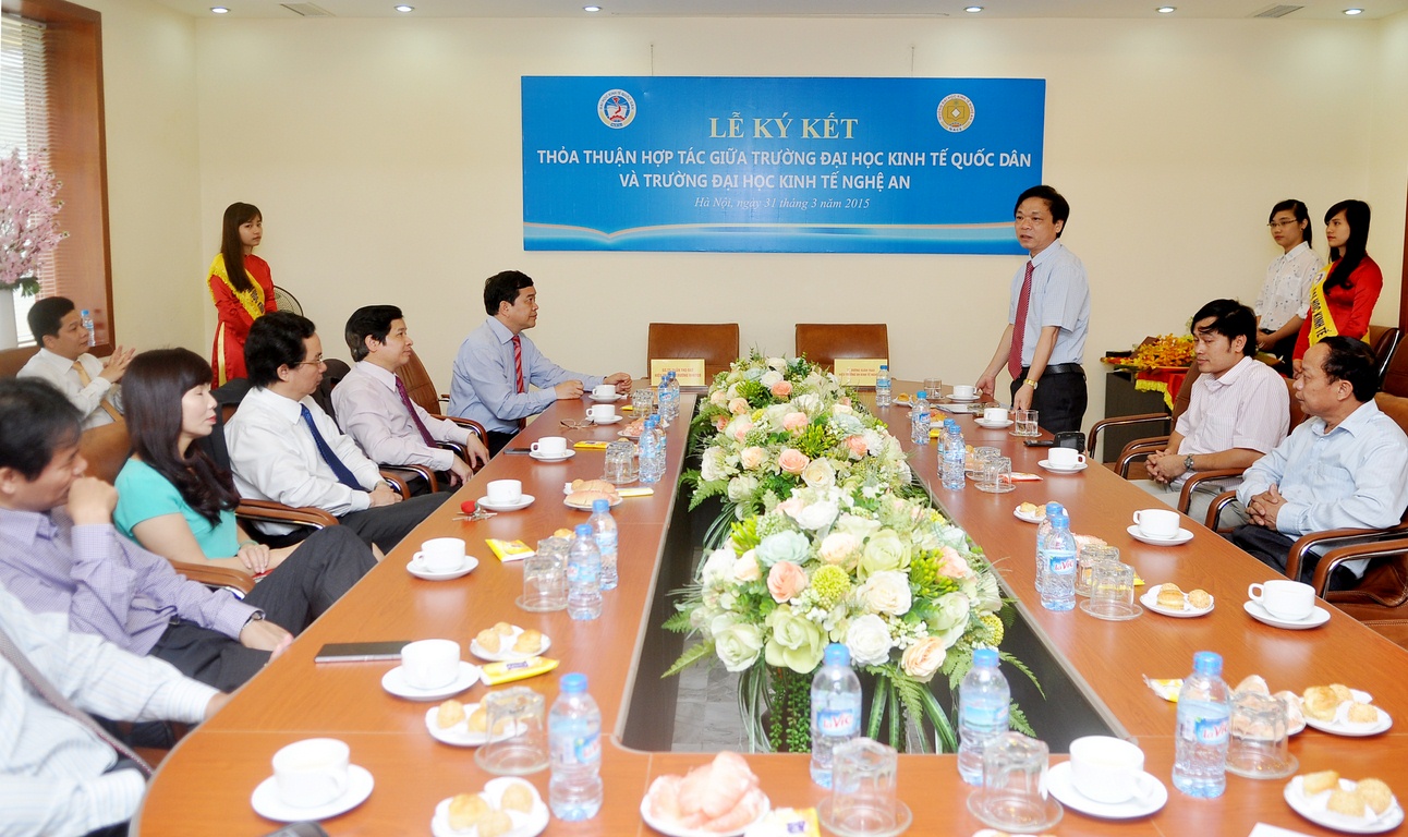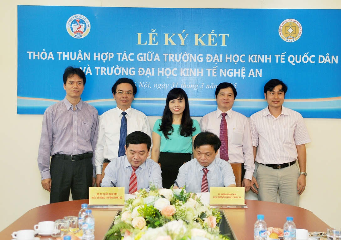 Sáng 31/3/2015, trường Đại học Kinh tế Quốc dân đã diễn ra Lễ Ký kết thỏa thuận hợp tác giữa trường Đại học kinh tế Quốc dân và trường ĐH Kinh tế Nghệ An. Tham dự lễ ký kết, về phía trường Đại học Kinh tế Quốc dân có GS.TS. Trần Thọ Đạt – Bí thư Đảng ủy, Hiệu trưởng, GS.TS.Phạm Quang Trung – Phó Hiệu trưởng, PGS.TS Phạm Hồng Chương – Phó Hiệu trưởng, PGS.TS Trần Thị Vân Hoa – Phó Hiệu trưởng, PGS.TS Hoàng Văn Cường – Phó Hiệu trưởng cùng đại diện lãnh đạo các phòng ban chức năng nhà trường. Về phía trường ĐH Kinh tế Nghệ An có TS.Dương Xuân Thao – Bí thư Đảng ủy, Hiệu trưởng, ThS. Nguyễn Văn Toàn – Phó TP QLĐT, ThS.Nguyễn Văn Đức – chuyên viên phòng QLĐT.
