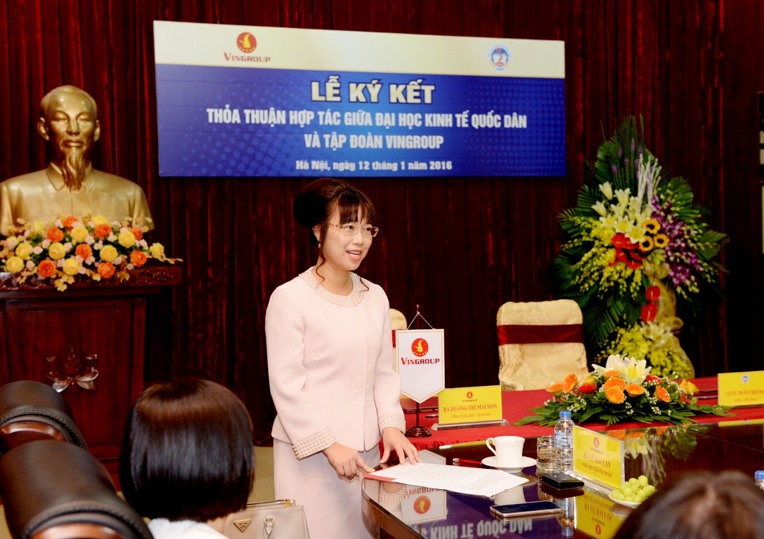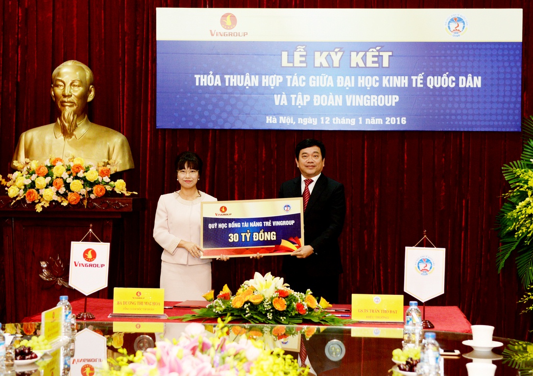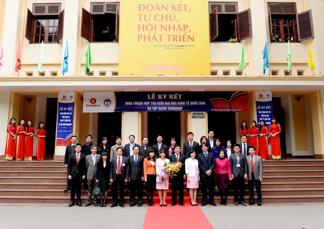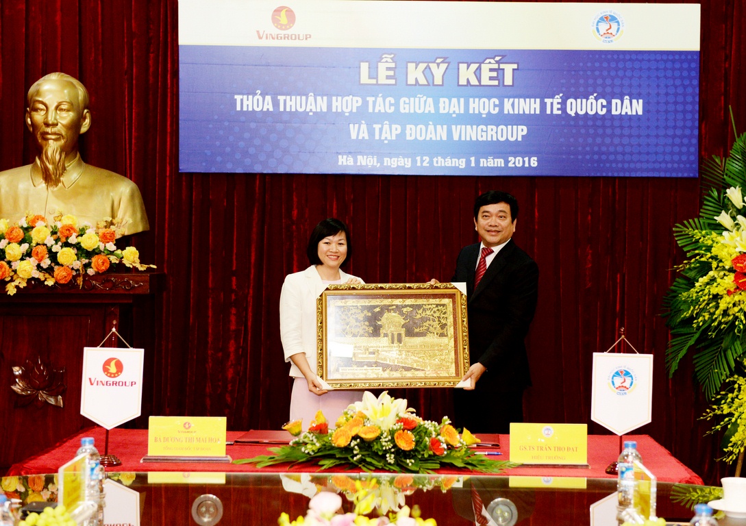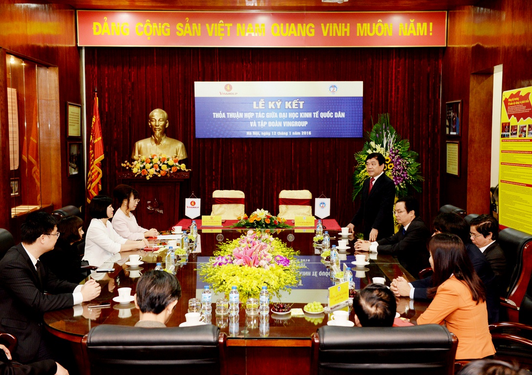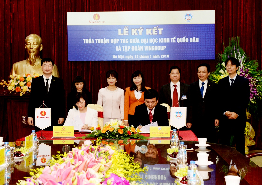 Sáng 12 tháng 01 năm 2016, tại Phòng truyền thống Nhà trường đã diễn ra Lễ Ký kết thỏa thuận hợp tác trong lĩnh vực đào tạo, nghiên cứu và tuyển dụng giữa trường Đại học Kinh tế Quốc dân và Tập đoàn Vingroup. Tham dự lễ ký kết, về phía Tập đoàn Vingroup có: Bà Lê Mai Lan – Phó Chủ tịch Tập đoàn Vingroup, Bà Dương Mai Hoa – Tổng giám đốc Tập đoàn Vingroup, Bà Trần Phương Lan – Giám đốc điều hành VinAcademy, Ông Lý Minh Tuấn – Giám đốc Quỹ thiện tâm và cán bộ lãnh đạo đại diện các phòng, ban, dự án liên quan của Tập đoàn. Về phía trường Đại học Kinh tế Quốc dân có GS.TS Trần Thọ Đạt – Hiệu trưởng, Bí thư Đảng ủy; GS.TS Phạm Quang Trung – Phó Hiệu trưởng, Phó Bí thư Đảng ủy; PGS.TS. Phạm Hồng Chương – Phó Hiệu trưởng, Phó Bí thư TT Đảng ủy; PGS.TS. Trần Thị Vân Hoa – Phó Hiệu trưởng, PGS.TS Hoàng Văn Cường – Phó Hiệu trưởng cùng đại diện lãnh đạo các tổ chức chính trị xã hội, Phòng ban, Khoa, Viện, Trung tâm, các giảng viên và sinh viên Nhà trường.