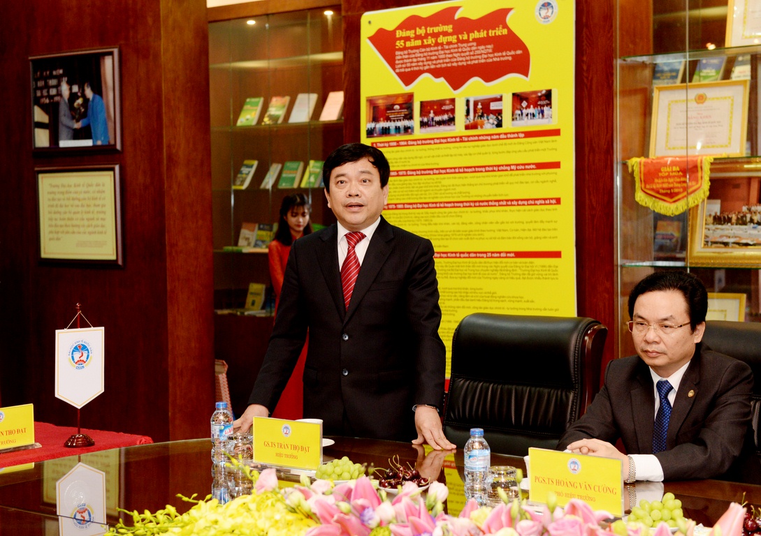Thay mặt Đảng ủy, Ban giám hiệu Nhà trường, GS.TS Trần Thọ Đạt – Hiệu trưởng đã phát biểu, bày tỏ sự trân trọng đề nghị hợp tác của lãnh đạo của tập đoàn Vingroup. Giáo sư Hiệu trưởng cũng khẳng định, mối quan hệ hợp tác giữa Đại học Kinh tế Quốc dân và Tập đoàn Vingroup là mối quan hệ hai chiều với mục đích phối hợp thế mạnh, gắn kết năng lực của cả hai bên. Việc ký kết thỏa thuận hợp tác lần này sẽ là một dấu mốc hết sức quan trọng, mở ra rất nhiều cơ hội trong mối quan hệ hợp tác giữa tập đoàn Vingroup và Nhà trường, hỗ trợ cho chiến lược gắn kết đào tạo phục vụ trực tiếp nhu cầu xã hội của nhà trường. Trong cơ chế tự chủ hiện nay của Trường, thỏa thuận hợp tác sẽ góp phần nâng cao chất lượng đào tạo của Đại học Kinh tế Quốc dân, mang đến cho sinh viên cơ hội nhận được những học bổng giá trị lớn, thực tập trong môi trường quốc tế và phát triển hết khả năng của mình. Giáo sư Trần Thọ Đạt gửi lời chúc sức khỏe tới các vị đại biểu, chúc cho Tập đoàn Vingroup ngày một phát triển, chúc cho sự hợp tác giữa hai bên sẽ thành công tốt đẹp.