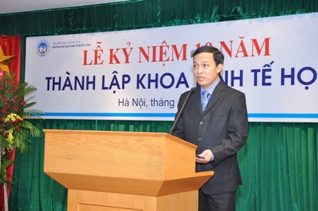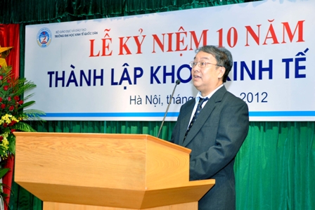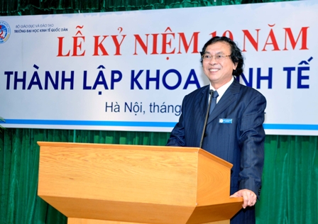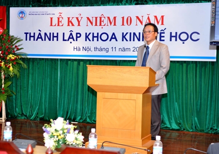 Thay mặt ban chủ nhiệm khoa, PGS.TS Vũ Kim Dũng – Trưởng khoa đã có bài phát biểu đánh giá về quá trình phát triển của khoa trong 10 năm qua và phương hướng phát triển của khoa Kinh tế học trong thời gian tới. Trong đó có đề cập đến vị thế của khoa trong quá trình phát triển của Đại học Kinh tế Quốc dân cũng như những thách thức trong quá trình phát triển của khoa. Trong 10 năm thành lập và phát triển, Khoa Kinh tế học luôn hoàn thành tốt nhiệm vụ đào tạo. Tính đến nay, Khoa Kinh tế học đã đào tạo được 361 cử nhân chuyên ngành kinh tế học và hàng trăm học viên cao học vào nghiên cứu của trường. Trong quá trình đào tạo, các sinh viên thể hiện tốt năng lực nghiên cứu khoa học. Nhiều sinh viên đạt giải thưởng nghiên cứu khoa học cao cấp trường, cấp bộ. Các sinh viên tốt nghiệp ra trường đã nắm giữ các vị trí quan trọng trong các cơ quan của chính phủ, các viện nghiên cứu và các doanh nghiệp. Hiện cơ cấu tổ chức của Khoa Kinh tế học gồm 3 bộ môn: Kinh tế vi mô, Kinh tế vĩ mô và Lịch sử kinh tế, với tổng số giảng viên và cán bộ là 47 người, trong đó có 5 PGS, 19 TS, 4 NCS, và 15 Th.s. Đội ngũ giảng viên của khoa có trình độ chuyên môn cao và năng lực nghiên cứu tốt. Do vậy, các giảng viên của khoa đã và đang chủ trì và tham gia nhiều đề tài nghiên cứu khoa học ở cấp Nhà nước, cấp Bộ, cấp cơ sở, cũng như ở các cơ quan của chính phủ và các tổ chức quốc tế. Cũng trong bài phát biểu của mình, PGS.TS Vũ Kim Dũng cũng đã đưa ra những định hướng phát triển của khoa trong giai đoạn tới với một số nội dung chủ đạo như cải tiến chương trình đào tạo; hệ thống học liệu; nâng cao chất lượng đội ngũ giảng viên; mở rộng hoạt động nghiên cứu khoa học và hợp tác quốc tế trong cả đào tạo và nghiên cứu khoa học.