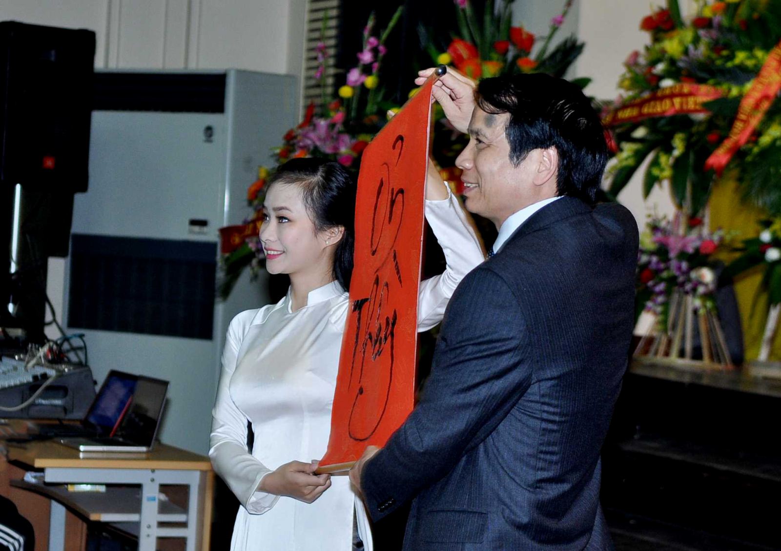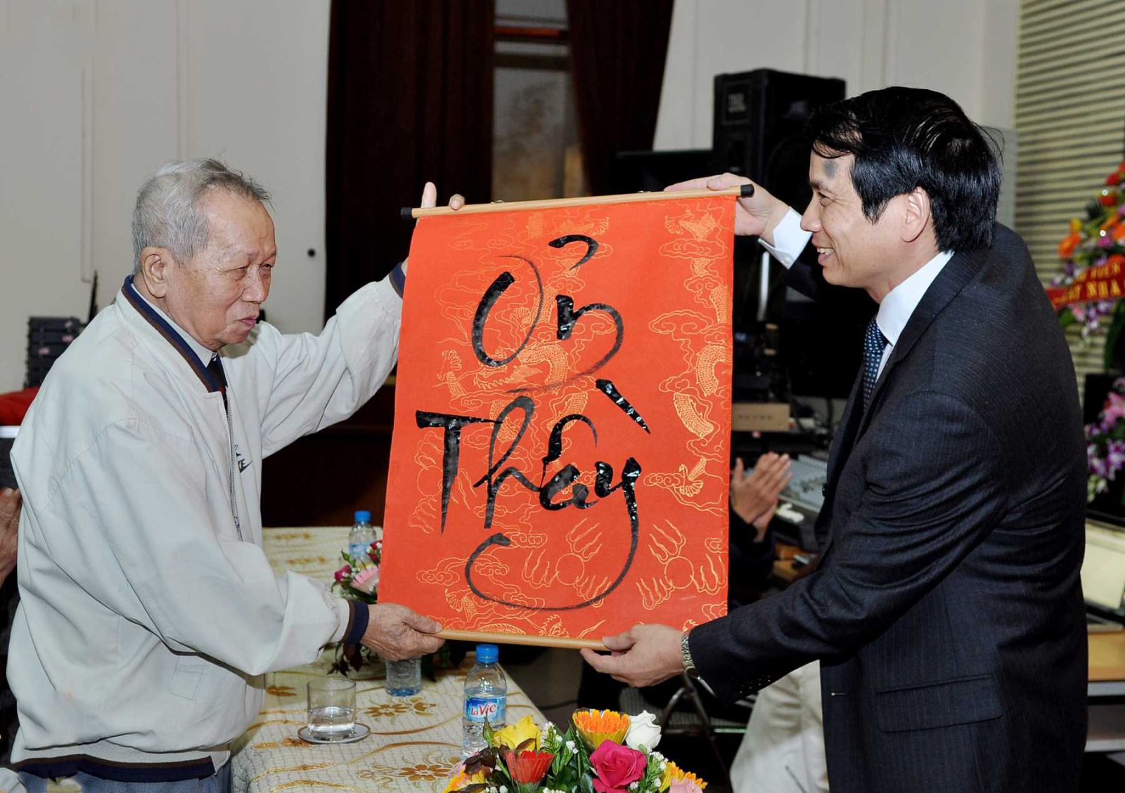 Thay lời tri ân các thế hệ lãnh đạo Trường đã nghỉ hưu, PGS.TS Phạm Mạnh Hùng, Bí thư,Hiệu trưởng trân trọng trao tặng GS.Mai Hữu Khuê- Nguyên Thứ trưởng Bộ Đại học và THCN ( nay là Bộ Giáo dục và Đào tạo), nguyên Hiệu trưởng trường ĐH KTQD bức họa thư pháp Ơn Thầy do chính SV thực hiện.