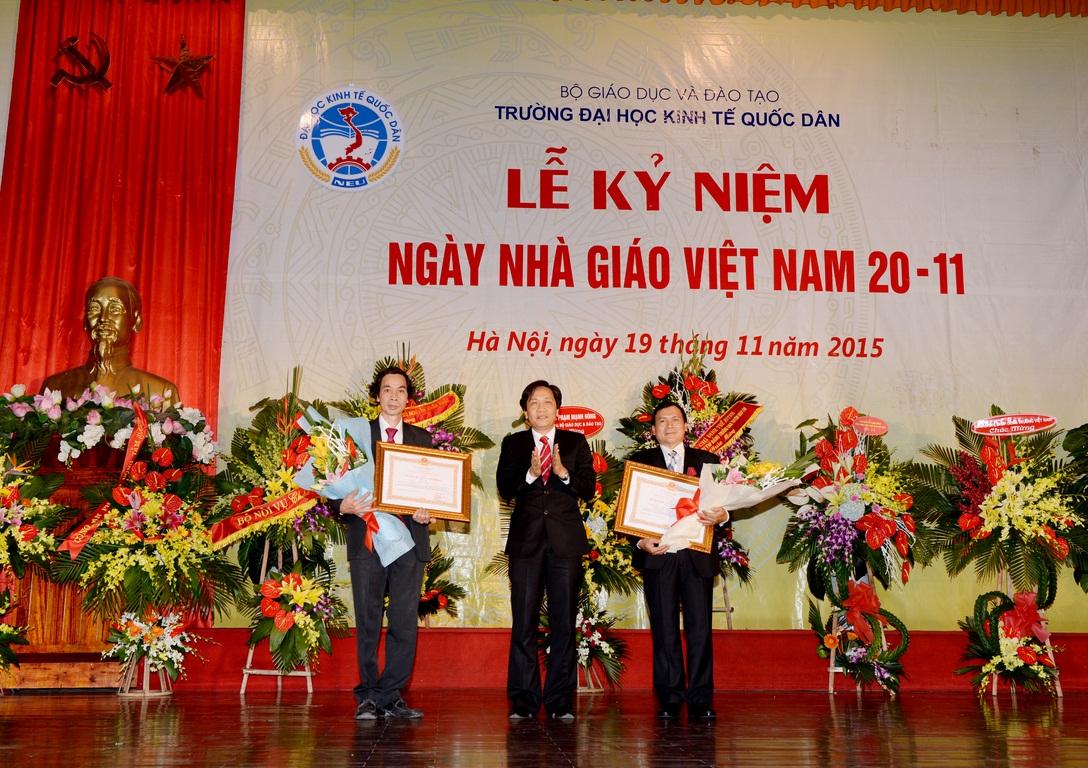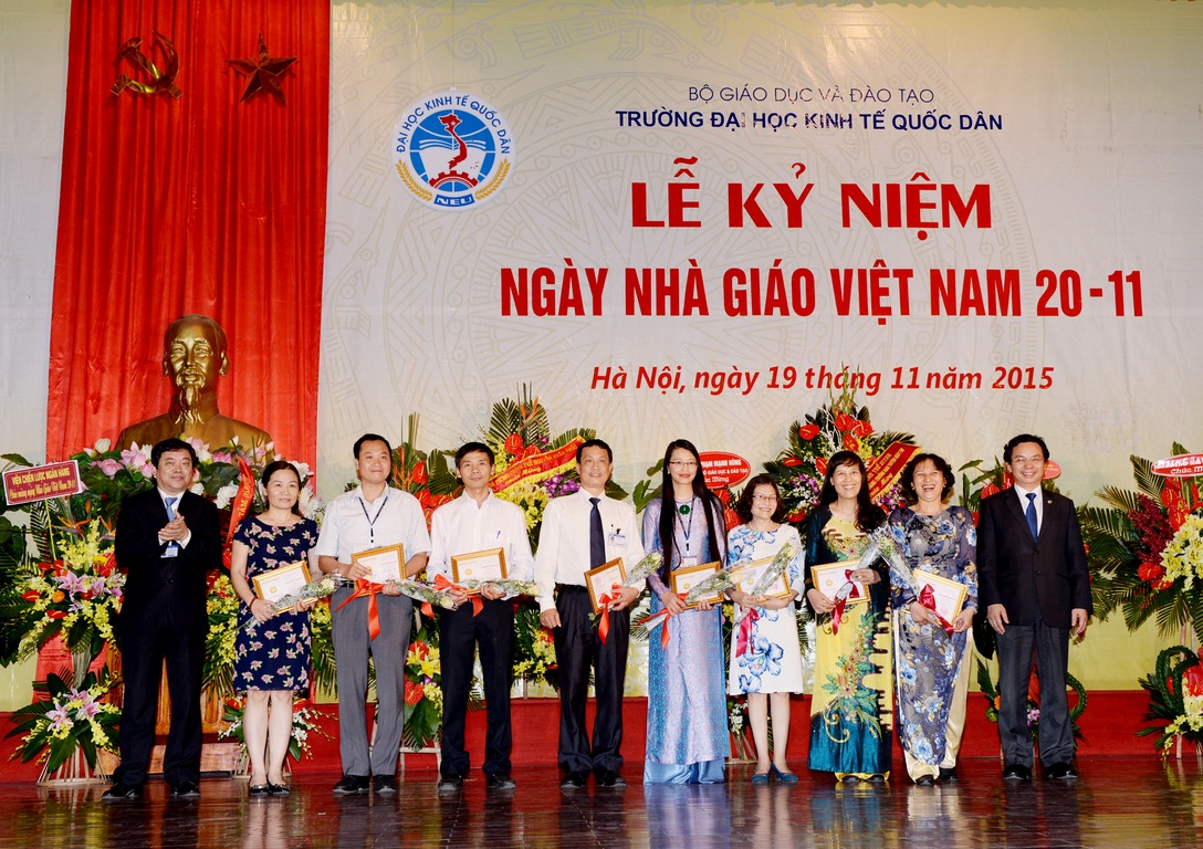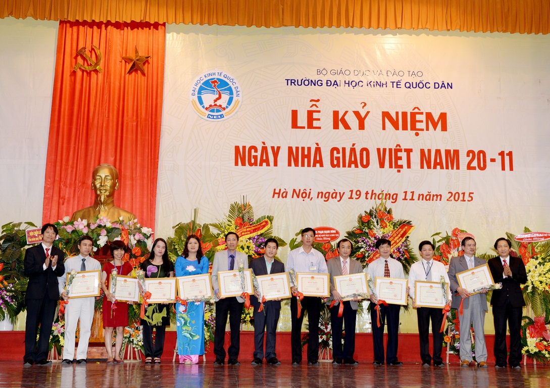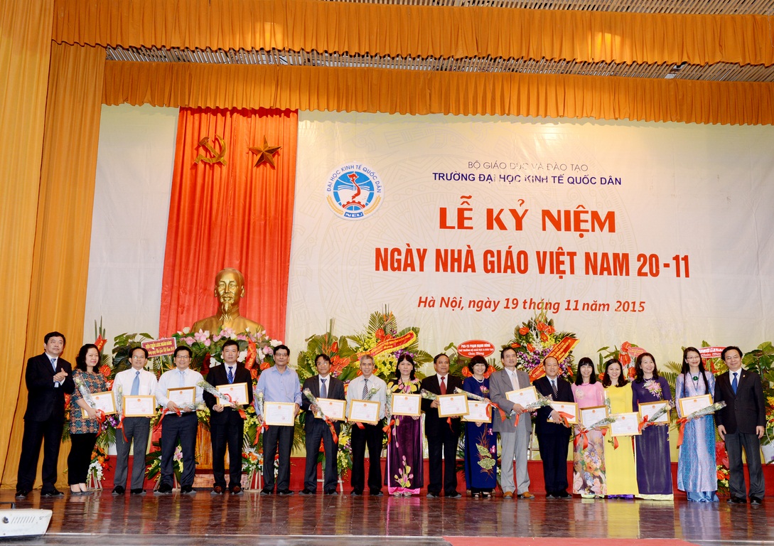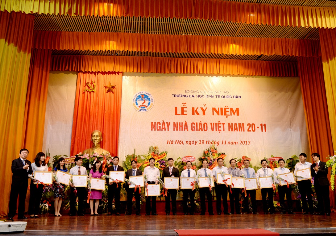 Hòa với niềm vui chung của các thế hệ Thầy và trò trên cả nước, sáng ngày 19/11/2015, tại Hội trường A – Nhà văn hóa, Trường Đại học Kinh tế quốc dân (ĐH KTQD) đã long trọng tổ chức Lễ kỷ niệm Ngày nhà giáo Việt Nam. Tại Lễ kỷ niệm, 02 nhà giáo đã được Chủ tịch nước tặng thưởng Huân chương Lao động hạng Ba; 03 nhà giáo đã được Bộ trưởng Bộ Văn hóa, Thể thao và Du lịch trao tặng Kỷ niệm chương Vì sự nghiệp Văn hóa, Thể thao và Du lịch; 26 nhà giáo được Bộ trưởng Bộ GD&ĐT tặng Kỷ niệm chương Vì sự nghiệp giáo dục; cùng nhiều tập thể và cá nhân có thành tích xuất sắc trong năm học 2013-2014 được Bộ GD&ĐT khen thưởng và công nhận danh hiệu thi đua.