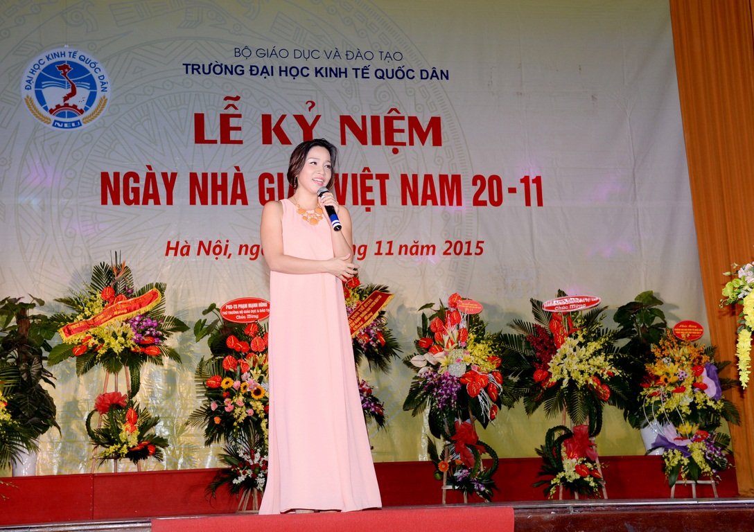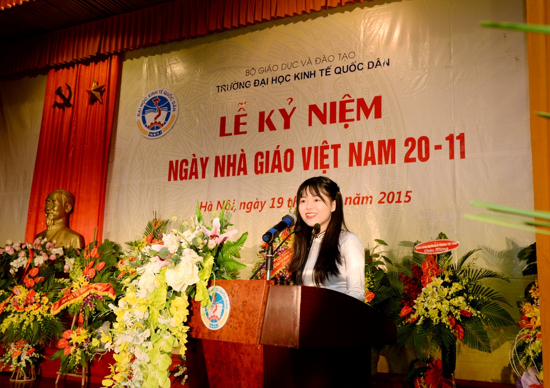 Vinh dự và tự hào được thay mặt cho các bạn sinh viên trong trường được phát biểu cảm nghĩ của mình tại Lễ kỷ niệm, sinh viên Nguyễn Thị Phương Thảo lớp Quản trị kinh doanh Quốc tế 56B đã xúc động bày tỏ: “Được đặt chân vào ngôi trường danh giá này đã là bước ngoặt lớn trong cuộc đời mỗi sinh viên KTQD chúng em, nhưng để có thể thành công trên con đường chúng em đã chọn lại là nhiều những chông gai, khó khăn phía trước. Song chúng em cũng biếtrằng, chúng em không bước đi một mình mà luôn có sự quan tâm từ các thầy cô Ban lãnh đạo nhà trường, luôn nhận được sự chỉ bảo, dìu dắt tận tình của các thầy cô dày dặn kinh nghiệm, trực tiếp giảng dạy trên lớp, giúp chúng em đã đang và sẽ thay đổi nhiều hơn nữa trong lối sống, tư duy và học tập”. Nhân kỷ niệm ngày Nhà giáo Việt Nam 20-11, sinh viên lớp Quản trị kinh doanh Quốc tế 56B cũng thay mặt cho toàn thể sinh viên đang học tập tại trường ĐHKTQD gửi trọn những tình cảm chân thành và ấm áp nhất đến những người thầy cô kính yêu bằng bó hoa tươi thắm và những lời chúc tốt đẹp nhất, mong rằng các thầy cô luôn dồi dào sức khỏe, hạnh phúc, thành đạt và có nhiều đóng góp hơn nữa cho nền giáo dục, đóng góp cho sự phát triển bền vững của trường Đại học Kinh tế Quôc dân trong thời kỳ đổi mới.