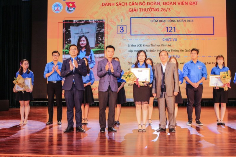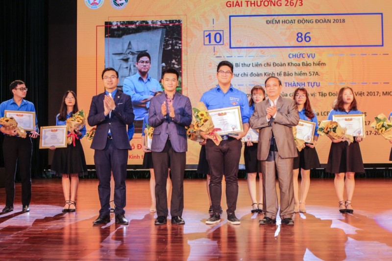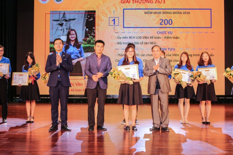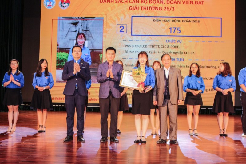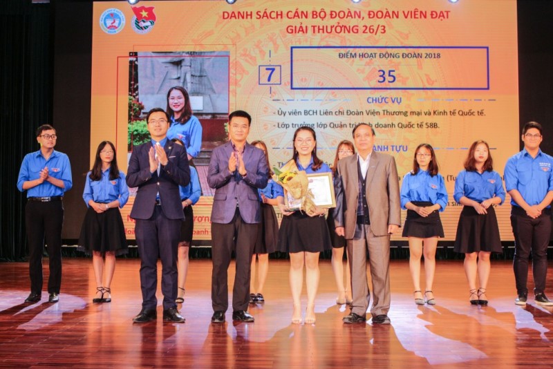 10 bạn Sinh viên vinh dự được nhận giải thưởng 26/03: Lê Thị Vân – Kết toán 58A; Vũ Lan Anh – Quản trị Kinh doan CLC 57; Đặng Ngọc Huyền – Hệ thống thông tin quản lý 57; Đinh Thị Khánh Hòa – Kinh tế Quốc tế 57A; Dương Hương Trà – Quản trị Nhân lực 58B; Nguyễn Thị Thu Uyên – QTKD Quốc tế 58A; Nguyễn Thị Phương Hoa – QTKD Quốc tế 58B; Tô Lan Hương – Tài chính Quốc tế 58; Kế hoạch 58B; Ngô Đức Việt – Kinh tế Bảo hiểm 57A.