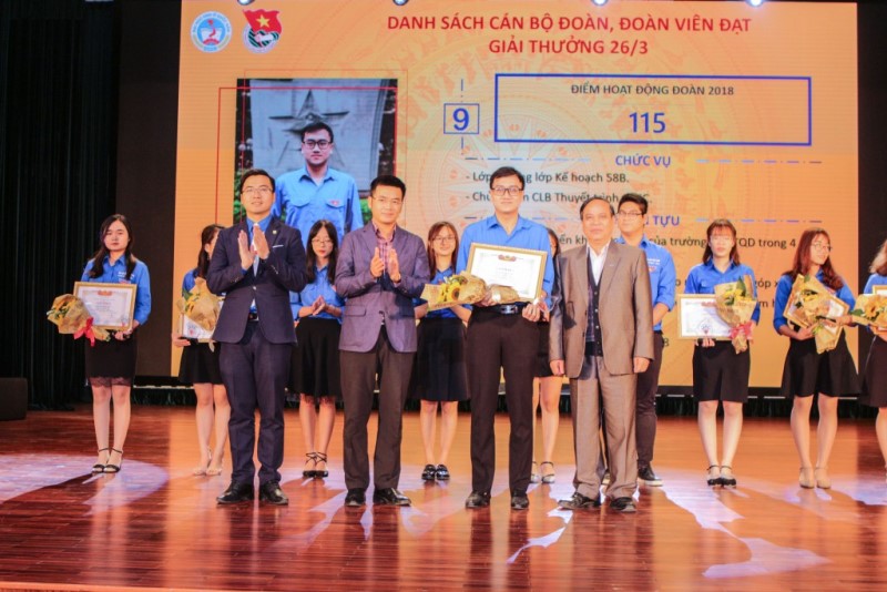 Sáng ngày 23/03/2018, Đoàn Thanh niên nhà trường đã tổ chức toạ đàm với Lãnh đạo nhà trường tại Phòng B202, tòa A2 – tòa trung tâm đào tạo và tổ chức Lễ kỷ niệm 88 năm ngày thành lập Đoàn TNCS Hồ Chí Minh, trao Kỷ niệm chương “Vì Thế hệ trẻ” cho cựu cán bộ Đoàn, trao giải trưởng 26/03 “Vinh danh Cán bộ Đoàn” cho 10 Cán bộ Đoàn xuất sắc và trao giải trưởng Bí thư Chi đoàn giỏi cấp trường cho 10 Bí thư Chi đoàn xuất sắc nhất tại Hội trường lớn B2 – Tòa nhà Trung tâm đào tạo.