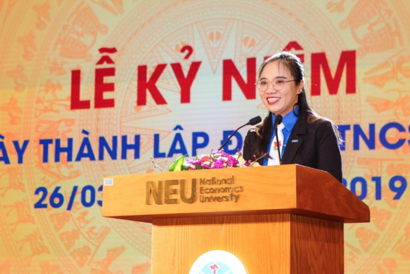 Sinh viên Phạm Hải Quỳnh đại diện cho 10 Sinh viên nhận giải thưởng 26/03 phát biểu tại chương trình