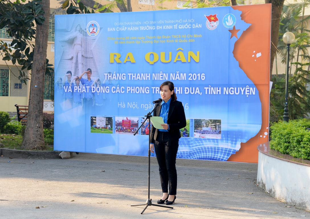 Thực hiện chương trình công tác năm học 2015– 2016, được sự chỉ đạo của Đảng ủy, Ban Giám hiệu, sáng ngày 01/3/2016, trước Đài kỷ niệm- sân giảng đường D, Ban Chấp hành Đoàn TN – Hội SV nhà trường long trọng tổ chức Ra quân tháng thanh niên năm 2016 và phát động các phong trào thi đua, tình nguyện chào kỷ niệm 85 năm thành lập Đoàn TNCS Hồ Chí Minh, 60 năm thành lập trường Đại học Kinh tế Quốc dân. Buổi lễ đã diễn ra trong không khí sôi nổi và tràn đầy nhiệt huyết của tuôi trẻ Nhà trường.