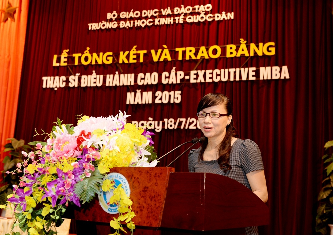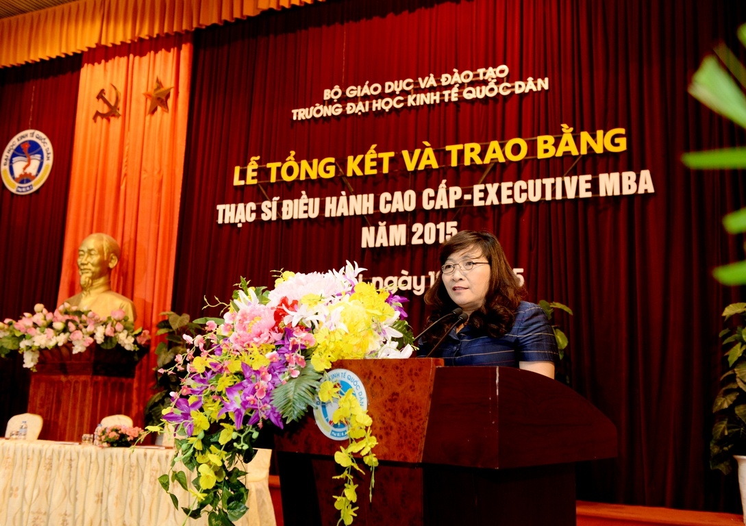 Đại diện cho lãnh đạo Bộ Giáo dục & Đào tạo, TS.Nguyễn Thị Kim Phụng – Q.Vụ trưởng Vụ Giáo dục Đại học đã phát biểu, gửi lời chúc mừng tới các tân thạc sĩ, tới tập thể sư phạm nhà trường và đánh giá cao sự thành công của chương trình EXECUTIVE MBA tại trường ĐH Kinh tế Quốc dân – đơn vị đầu tiên trongcả nước được Bộ Giáo dục và Đào tạo phê duyệt cho phép đào tạo thạc sĩ Điều hành cao cấp Executive MBA tại Việt Nam. TS. Nguyễn Thị Kim Phụng cũng mong rằng nhà trường, đặc biệt là Viện Đào tạo Sau Đại học sẽ tiếp tục phát huy những thành tích đã đạt được, đưa chương trình ngày một phát triển hơn nữa.