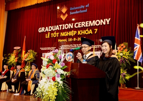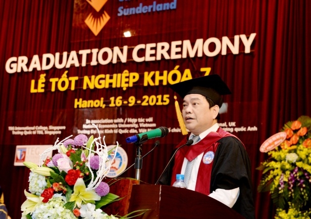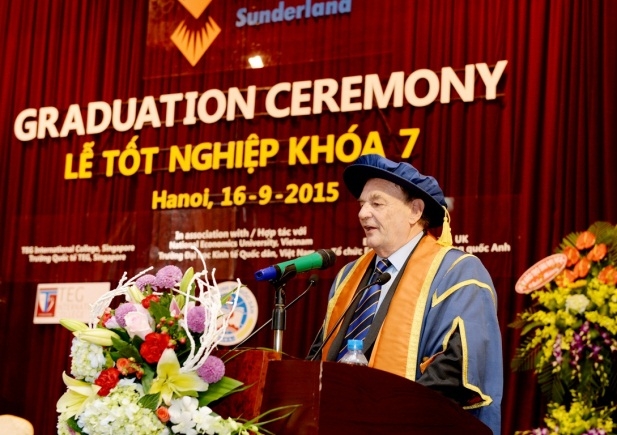 Thay mặt cho Trường Đại học tổng hợp Sunderland – Vương quốc Anh, GS. Gary Holmes – Phó hiệu trưởng bày tỏ niềm vui và gửi lời chúc mừng nồng nhiệt tới tất cả các sinh viên tốt nghiệp. GS Phó hiệu trưởng không quên dặn dò các tân cử nhân: “Ngày hôm nay chỉ là sự khởi đầu cho hành trình phiêu lưu, học hỏi và trải nghiệm của các em. Trong những năm tháng sau này, các em sẽ phải đối mặt với những thách thức to lớn trong việc xác định con đường mình đi và bắt kịp với những thay đổi không ngừng của thế giới. Các em sẽ phải cởi mở và linh hoạt để nắm bắt những thay đổi này – cần phải rõ ràng trong mục tiêu và mong ước của mình – nhưng cũng đừng quên những chuỗi giá trị, những kiến thức và kỹ năng các em đã được trang bị”. GS. Gary Holmes cũng gửi lời cảm ơn tới trường Đại học Kinh tế quốc dân, đặc biệt là Ban giám hiệu nhà trường đã hỗ trợ hết mình để có được thành công của chương trình đào tào Cử nhân quốc tế. “Mối quan hệ đặc biệt của chúng tôi đối với trường Trường Đại học Kinh tế Quốc dân, một trường ĐH danh tiếng tại Hà Nội, Việt Nam là một ví dụ tuyệt vời cho sự hợp tác thành công và lâu dài. Chúng tôi cùng chia sẻ những giá trị quan trọng; chúng tôi đặt việc giáo dục và lợi ích của sinh viên lên trên hết, cũng như  luôn ưu tiên việc giúp đỡ cộng đồng và cống hiến vì tổ quốc mình. Đó là một trong số những điều chúng tôi vô cùng tự hào”, GS tới từ Vương quốc Anh khẳng định.