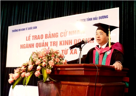 Phát biểu tại buổi lễ, GS.TS.Phạm Quang Trung – Phó Hiệu trưởng đã nhiệt liệt chúc mừng thành công bước đầu của các tân cử nhân đã nỗ lực hết mình trong suốt 5 năm qua để đi đến thành công, được nhận tấm bằng cử nhân cao quý của trường ĐHKTQD; đồng thời Giáo sư Phó Hiệu trưởng khẳng định, 5 năm qua là một dấu mốc hợp tác thành công giữa Trường Đại học Kinh tế quốc dân và Trung tâm DGTX của tỉnh Hải Dương trong vấn đề phát triển nguồn nhân lực của tỉnh. Thay mặt Ban lãnh đạo nhà trường, Giáo sư đặc biệt ghi nhận và cảm ơn sự nỗ lực, cố gắng của tập thể cán bộ Trung tâm ĐTTXa, các cán bộ của Trung tâm GDTX tỉnh Hải Dương đã tận tâm, tận lực trong sứ mệnh phát triển giáo dục, đáp ứng nhu cầu nguồn nhân lực chất lượng cao của tỉnh Hải Dương và mong muốn rằng các tân cử nhân tiếp tục học hỏi, vừa làm vừa học, học trong thực tế công tác, học trong giao tiếp với đồng nghiệp, học ở trường đời rộng lớn để có thể đáp ứng yêu cầu ngày càng cao của xã hội, đạt được khát vọng tiến thân chính đáng của mình và khẳng định được thương hiệu khóa đầu tiên hệ ĐTTXa – Trường ĐH KTQD tại Hải Dương.