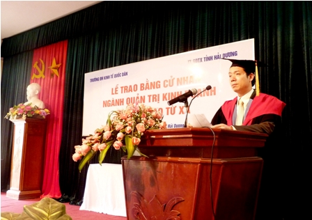 Trong niềm vui ngày tốt nghiệp, đại diện cho các tân cử nhân, tân cử nhân Phạm Thị Trúc đã phát biểu, bày tỏ lòng biết ơn sâu sắc tới Ban lãnh đạo trường Đại học Kinh tế Quốc dân, Lãnh đạo, cán bộ quản lý Trung tâm Giáo dục thường xuyên tỉnh Hải Dương, Trung tâm đào tạo từ xa, các thầy cô giáo đã tận tình truyền đạt cho các sinh viên những kiến thức, kỹ năng cần thiết, đã giúp đỡ các sinh viên trong suốt quá trình học tập và xin hứa sẽ đem hết tâm lực, trí lực, vận dụng một cách uyển chuyển và hài hòa vào thực tiễn để minh chứng và khẳng định với xã hội rằng: Sản phẩm nguồn nhân lực mà trường KTQD cung cấp cho xã hội thông qua các chương trình đào tạo nói chung, và đặc biệt là chương trình đào tạo từ xa nói riêng là sản phẩm có chất lượng tốt – Tốt về nhân cách đạo đức – Tốt về tư duy kiến thức – Tốt về kỹ năng tác nghiệp chuyên môn.
