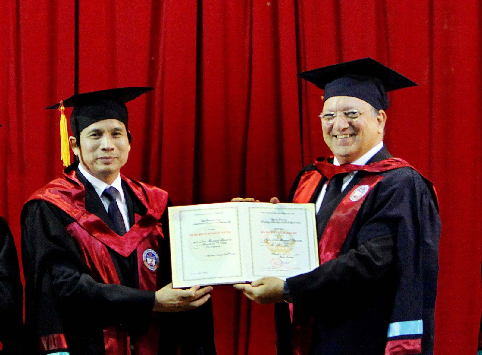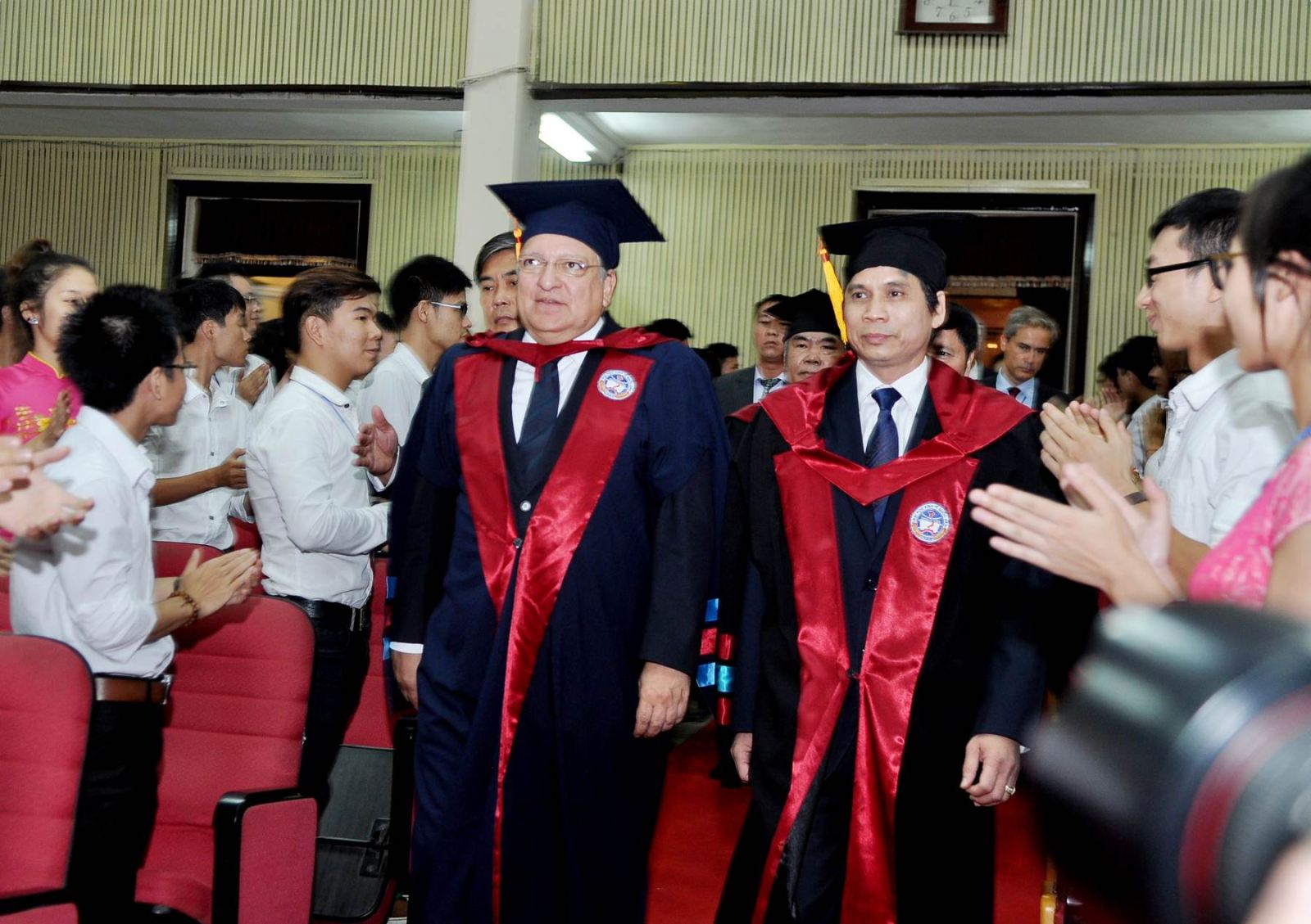 Sau phần công bố Quyết định, PGS.TS Phạm Mạnh Hùng, Thứ trưởng Bộ GD& ĐT, kiêm Bí thư Đảng ủy, Hiệu trưởng đã chính thức trao bằng Tiến sĩ danh dự cho Ngài José Manuel Durão Barroso – Chủ tịch Ủy ban Châu Âu.