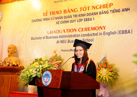 Phát biểu tại buổi lễ, tân cử nhân Nguyễn Ngọc Sơn Tùng – thủ khoa của chương trình EBBA khóa 1 đã đại diện cho 48 tân cử nhân EBBA năm 2013 bày tỏ niềm vui, niềm tự hào khi được học tập và nghiên cứu dưới mái trường Đại học Kinh tế Quốc dân nói chung và Viện Quản trị Kinh doanh nói riêng và gửi lời cảm ơn chân thành tới các thầy cô giáo, tới các cán bộ quản lý đã tạo điều kiện tốt nhất cho các sinh viên trong suốt những năm qua và hứa sẽ nỗ lực hơn nữa để đóng góp tài năng, trí tuệ cho sự phát triển đất nước trong nền kinh tế hội nhập.