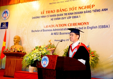 Trong bài phát biểu chúc mừng các Tân cử nhân, GS.TS. Phạm Quang Trung nhấn mạnh “Sự thành công của 48 tân cử nhân tốt nghiệp hôm nay không chỉ là những minh chứng thật đáng tự hào về sự nỗ lực phấn đấu học tập và thành đạt của mỗi sinh viên và qúy vị phụ huynh sinh viên mà còn là thành quả rất đáng tự hào của tập thể sư phạm Viện Quản trị Kinh doanh và các thầy cô giáo tham gia giảng dạy và quản lý chương trình EBBA”. GS.TS. Phạm Quang Trung đã đề nghị Viện Quản trị Kinh doanh tiến hành tổng kết 5 năm đào tạo EBBA và chuẩn bị các điều kiện để kiểm định chất lượng chương trình và lấy chứng nhận kiểm định Quốc tế cho chương trình EBBA. Giáo sư Phạm Quang Trung đã chúc mừng và tin tưởng rằng 48 tân khoa cử nhân tốt nghiệp hôm nay sẽ tiếp tục phát huy sức mạnh và tinh thần sáng tạo, tiên phong và sức trẻ của chương trình EBBA, tiếp tục học tập và phấn đấu để có thể gặt hái những thành công to lớn hơn nữa trên con đường sự nghiệp của mình, qua đó góp phần làm rạng danh tên tuổi và uy tín của chương trình EBBA, uy tín của Viện Quản trị Kinh doanh và uy tín của trường đại học KTQD.