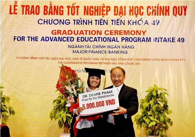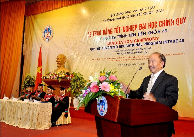 Đến dự buổi lễ và chia vui cùng các tân cử nhân, GS.Dean Van Phạm – Giảng viên trường Đại học Tổng hợp California – Long Beach – Hoa Kỳ đã phát biểu, bày tỏ niềm vui khi được trở về quê hương tham gia vào công cuộc giáo dục nước nhà để tạo ra được các nhân tài cho đất nước, góp phần xây dựng xã hội ngày một phát triển, thịnh vượng, công bằng và bác ái. GS.Dean Phạm cũng mong muốn rằng, các tân cử nhân, dù ở đâu, trên cương vị nào, đều phải giữ vững và phát huy tinh thần của sinh viên chương trình tiến tiến – luôn luôn phải có sự “khác biệt”.